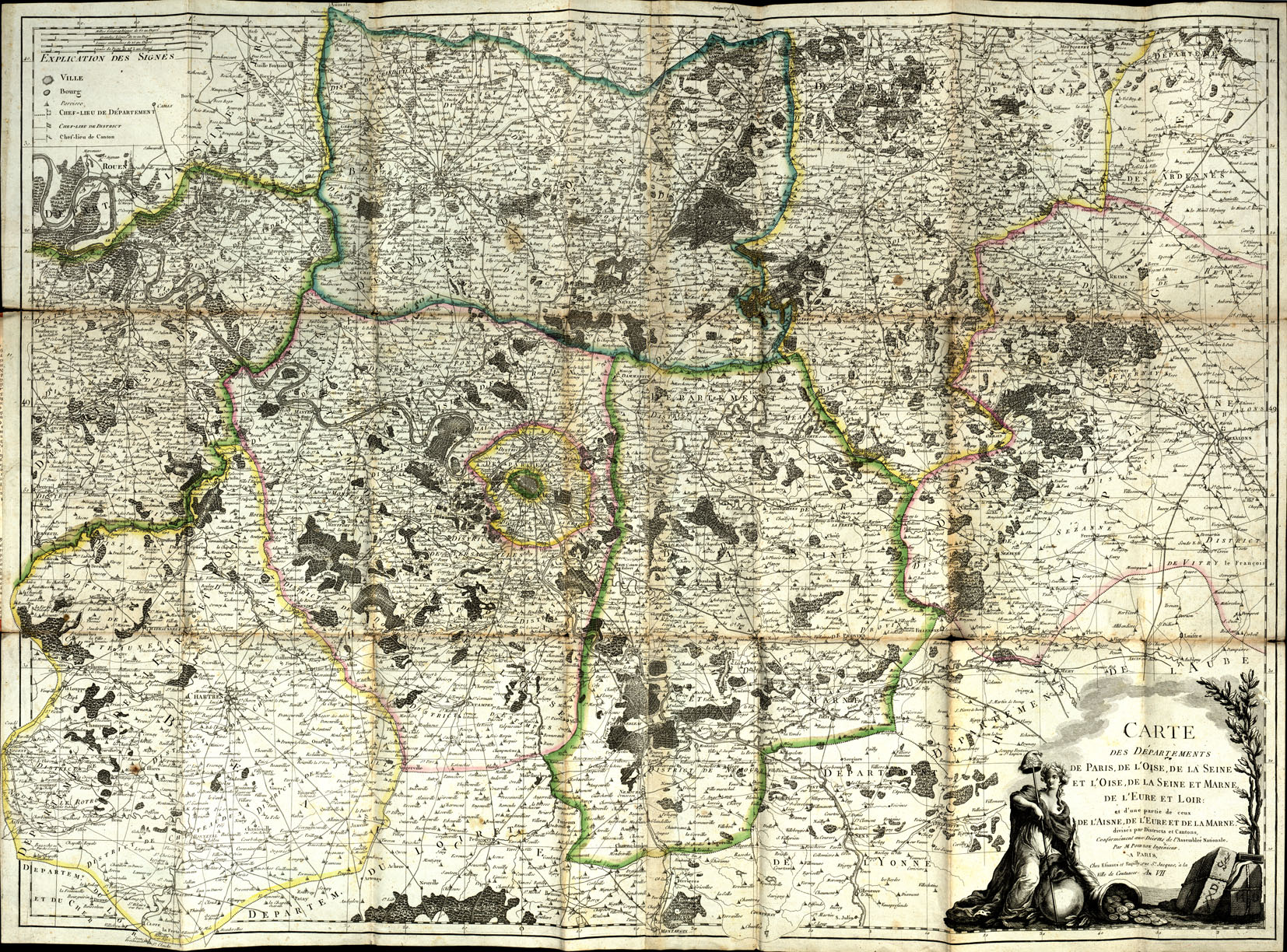 "Une partie de ceux de l'Aisne, de l'Eure et de la Marne, divisée par Districts et Cantns conformement aux Décrets de l'Assemblée nationale. Par M. Poirson Ingénieur à Paris chez Esnarts et Rapilly, rue St. Jacques, à la Ville de Contances An. VII (1799). L'autore ci offre una rappresentazione dei sovra descritti luoghi alla scala di 1:260.700 circa. Bella incisione in rame in due fogli riuniti. Sono segnate le foreste nell'angolo sud-est è una incisione allegorica della ricchezza."