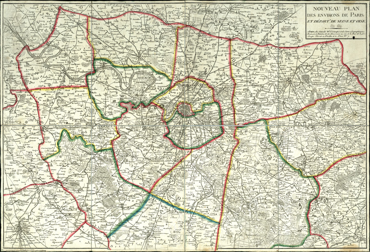 "De Deine et Oise, Paris, chez Esnault md. d'Estampes et de Cartes Géographiques. Bouleward de Richelieu dit des panorames ecc. Bella incisione in rame in un solo foglio alla scala di 1:187.858 circa. I limiti tra i Dipartimenti spiccano per colori applicati con pennello. Sono segnate, oltre la viabilità e l'idrografia, le foreste ed i piccoli luoghi abitati che sono in prospettiva, mentre le grandi città figurano, in pianta, o con circoli. La planimetria è bene delineata, ma alla chiarezza della Carta nuociano i troppi vocaboli. La copia posseduta è montata su tela a stacchi. Si ritiene appartenente alla seconda metà del sec. XVIII."