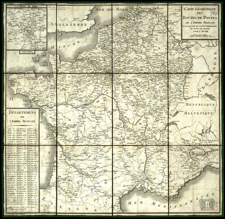 "Dressée par ordre du Conseil d'amministration des postes aux Chevaux pour l'An XIII. Echelle de 12.000 mètres. Carta incisa su rame in solo foglio è montata su tela a stacchi. E' incisa da Tardieu, scritta da Pachoux. Nell'angolo nord-ovest è la Carta dei dintorni di Parigi, nell'angolo sud-ovest è la tabella dei 109 Dipartimenti della Francia. E' costruita alla scala di 1:2.220.000 circa. Appositi segni indicano le mezze poste, ed il quarto di posta. (Dal registro di carico la suddetta carta risulta in sostituzione alla Bianconi 406)."