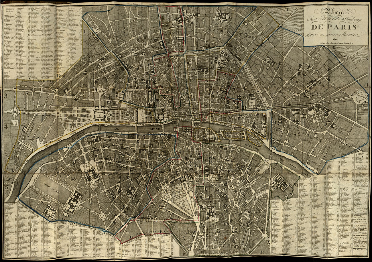 "Plan routier de la ville et faubourgs de Paris divisé en douze Mairies, 1811. Scala grafica: 150 tese corrispondenti al rapporto metrico approssimativo di 1:10.441. Orientamento normale. A Paris chez Jean, rue St. Jean de Beaunvais n. 10. Rappresenta la pianta della città di Parigi. Deriva da incisione su rame ed è stampato in nero. I limiti vari "faubourgs" sono colorati ad acquerello. Agli angoli del foglio è posta la leggenda delle vie, piazze ecc. della città."