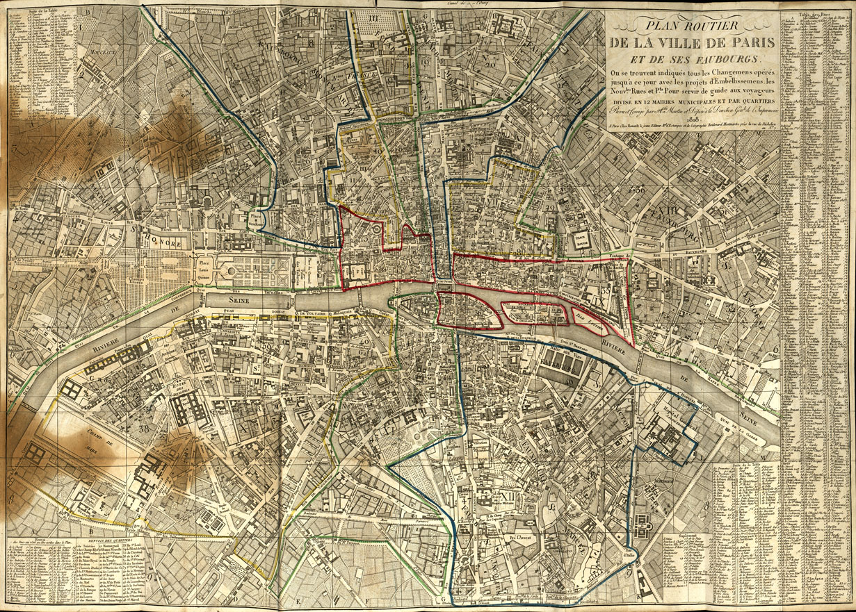 "Plan routier de la ville de Paris et de ses faubourgs. - Ou se trouvent tous les Changemens opéré jusqu'a ce jour avec les projets d'embellissemens les nouvelles rous et pour servir de guide aux voyageurs divisé en 12 mairies municipales et par quartiers, revu et corigé par A. Martin 1818 a Paris chez Esnault le jeune, editeur ecc. Boulevard Montmatre près la rue de Richelieu au n. 7. Come la precedente, rappresenta la pianta della città di Parigi. Proviene da incisione su rame ed è stampata in nero. I limiti amministrativi sono acquerellati a varie tinte. La leggenda dei nomi è posta ai margini del foglio. Da confronti fatti risulta che il rapporto è di 1 a 9.350 circa."