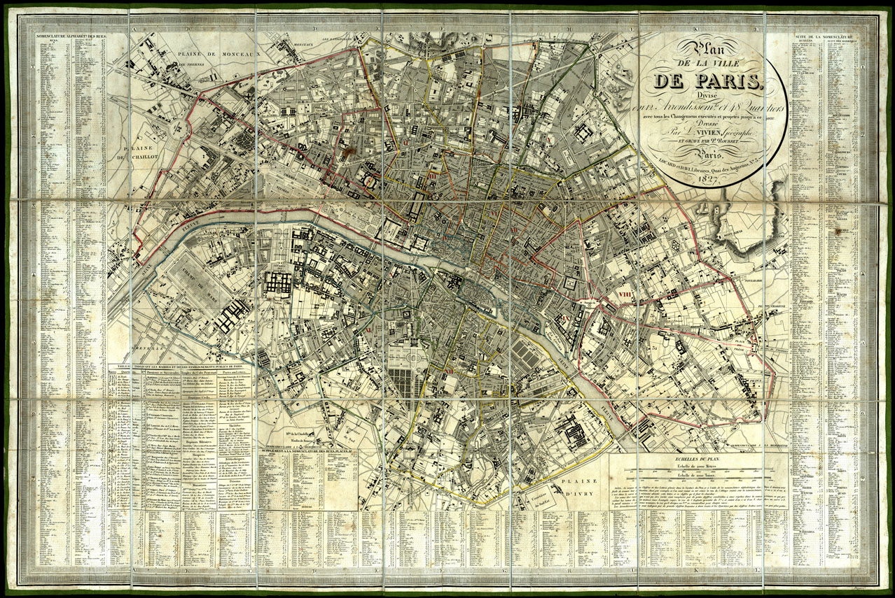 "En 12 Arrondissements et 48 Quartiers, Paris, Locard et Davi. La carta montata su tela a stacchi è in un solo foglio comprese le leggende. Rappresenta la pianta della città di Parigi, suddivisa nei suoi 12 circondari e 48 quartieri. E' stata compilata dal geografo L. Vivien e pubblicata dall'editore Locard et Davi. L'incisione è dovuta a P. Rousset è redatta in nero, i limiti amministrativi sono ripassati in acquerello a vari colori. Lungo i margini del foglio sono elelncate le indicazioni riflettenti la città."