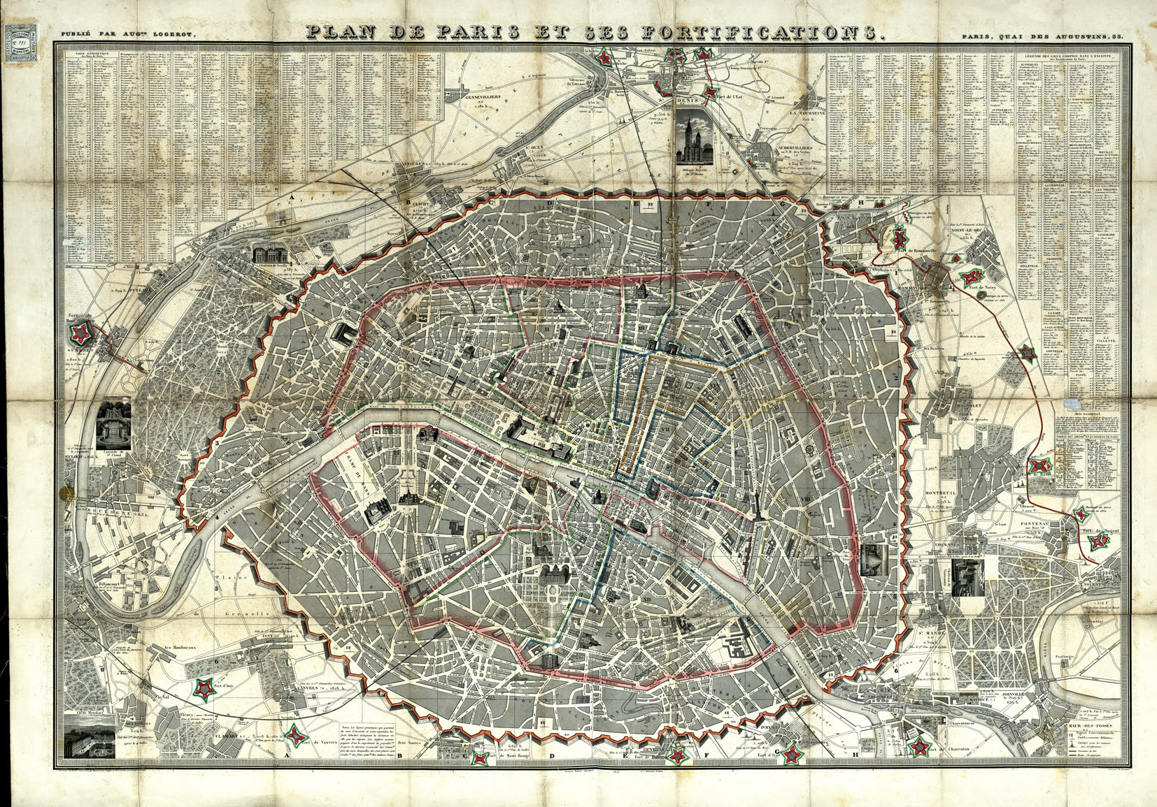 "Publié par Aug. "Logerot, Paris, quai des Augustins 35, dessiné par Maillard Géographe et Toussant Architecte, 1843. Bella incisione in rame in solo foglio, eseguita da Chamonin. Thenot incise i monumenti, lavoro mirabile per prospettiva e finezza di bulino. La cinta delle fortificazioni spicca per acquerello, come pure sono acquerellati i forti situati oltre la cinta. E' questa una buona Carta di carattere militare perchè sono posti in evidenza strade strategiche, campi per i lavori delle fortificazioni, e stabilimenti militari nè mancano come si è accennato, le prospettive di palazzi, chiese e monumenti. Il rapporto è di 1 a 12.000 circa."