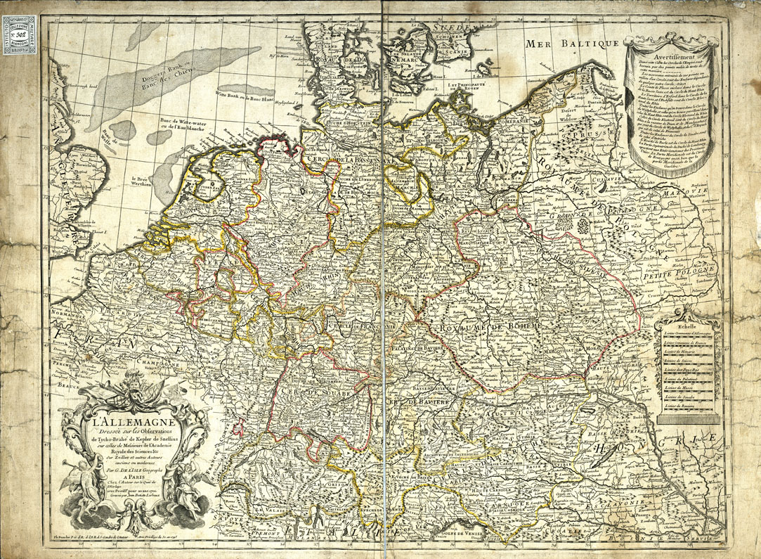 "Sur Zeiller et autres auteurs anciens ou modernes par G. de l'Isle Géographe à Paris. Gravée par Jean Batiste Liébaux, 1701. Questa incisione su rame, sebbene accurata come intaglio, offre una carta poco chiara per i molti vocaboli introdottivi. Da questo difetto è immune la rappresentazione della Polonia. L'origine delle longitudini è nell'isola del Ferro. La copia posseduta è montata su tela. Limiti: nord, Suéde sud, Golfe de Vinise est, Petite Pologne ovest, Normandie."