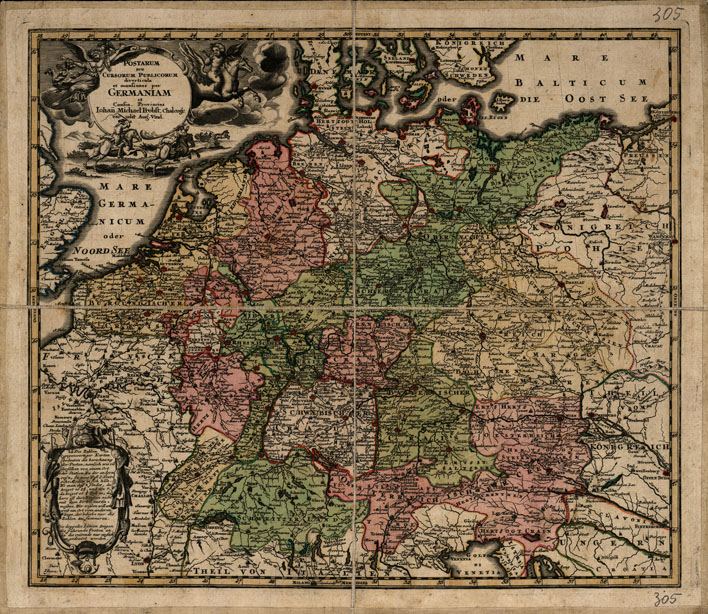 "Provincias-Iohan Michael Probts, Chalcogr. Exc Udit Vind. Un grado di meridiano è lungo mm. 30, ne risulta che il rapporto è di 1:3.700.000. Incisione su rame molto confusa, è un foglio unico rappresentante le vie postali della Germania. I vari stati distinti con coloritura diversa. I paesi più importanti sono segnati con minio. Le longitudini provengano dalle isole Azzorre (gruppo est). La copia posseduta è montata su tela a stacchi."