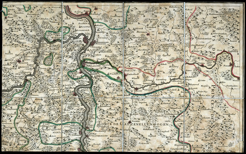 "La Sarre, la Moselle, et la basse Alsace, contenant partie du Palatinat, des esclectorats de Mayence, et de Treves, des Evechés de Spire et de Wormes avec le Duchés de deux ponts et de Simmerents Comtés de Sarbrik, Ottweiller, Bitche, Saverden, Falkenstein, Linanges, Veldents, haut et bas Sponheim, les Seigneuries de Bliscastel, Landstoul, Crombach, Reypolkirch, Grevestein, Kirn, Oberstein, Lixheim, Lauteck, Dagstoul, la Petite Pierre, et Dimering. A Paris chez le Sr. Jaillot, Géographe ordinarie du Roy ecc. Carta incisa in rame in 6 fogli (senza data e senza graduazione). Nel foglio 6 è contenuto il titolo e nel foglio 5 sono scale grafiche in leghe di Francia e di Germania, il rapporto è di 1 a 143.800 circa. L'orografia è figurata a volo d'uccello molto artisticamente, la viabilità l'idrografia ed i paesi sono bene rappresentati non mancano le foreste. I limiti amministrativi e le località più importanti sono colorati all'acquerello."