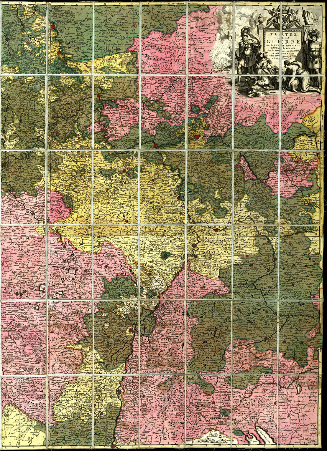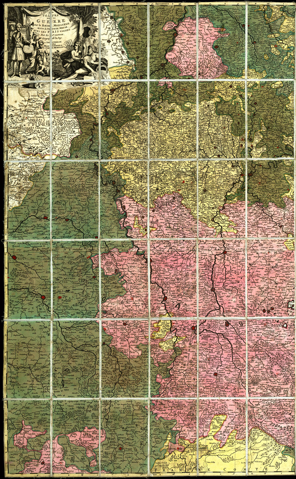 "Par le Sr. Sanson, Geographe du Roy, à Amsterdam, chez Jean Covens et Corn Mortier. Titolo sotto il quale è la firma K. Kuirberts in et f. Altro titolo è situato nell'ang. nord-est, dal quale la Carta sembrerebbe compilata non già dal Sanson, ma sulle memorie: Teatre de la Guerre, sur le Rhein, Moessele, Mayn e le Necker, sur les memoires du Sr. Sanson, à Amsterdam, chez Covens et Corn. Mortier, avec priviligie. Sono 4 fogli incisi su rame, riuniti su tela, a stacchi e siamo inditti a ritenere che i due fogli di sinistra siano opera diretta del Sr. Sanson Géographe du Roy, e quelli di destra siano dovuti ad altro compilatore. Epoca: fine del secolo limiti: Nord, Diest Sud Basle Est, Wald Gemund Ovest, Reims. Mancano i segni convenzionali."