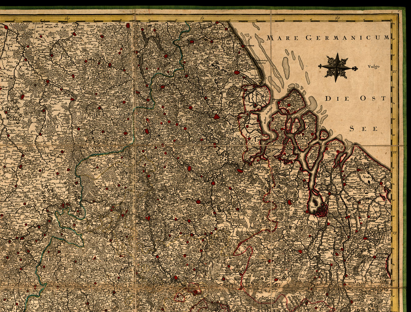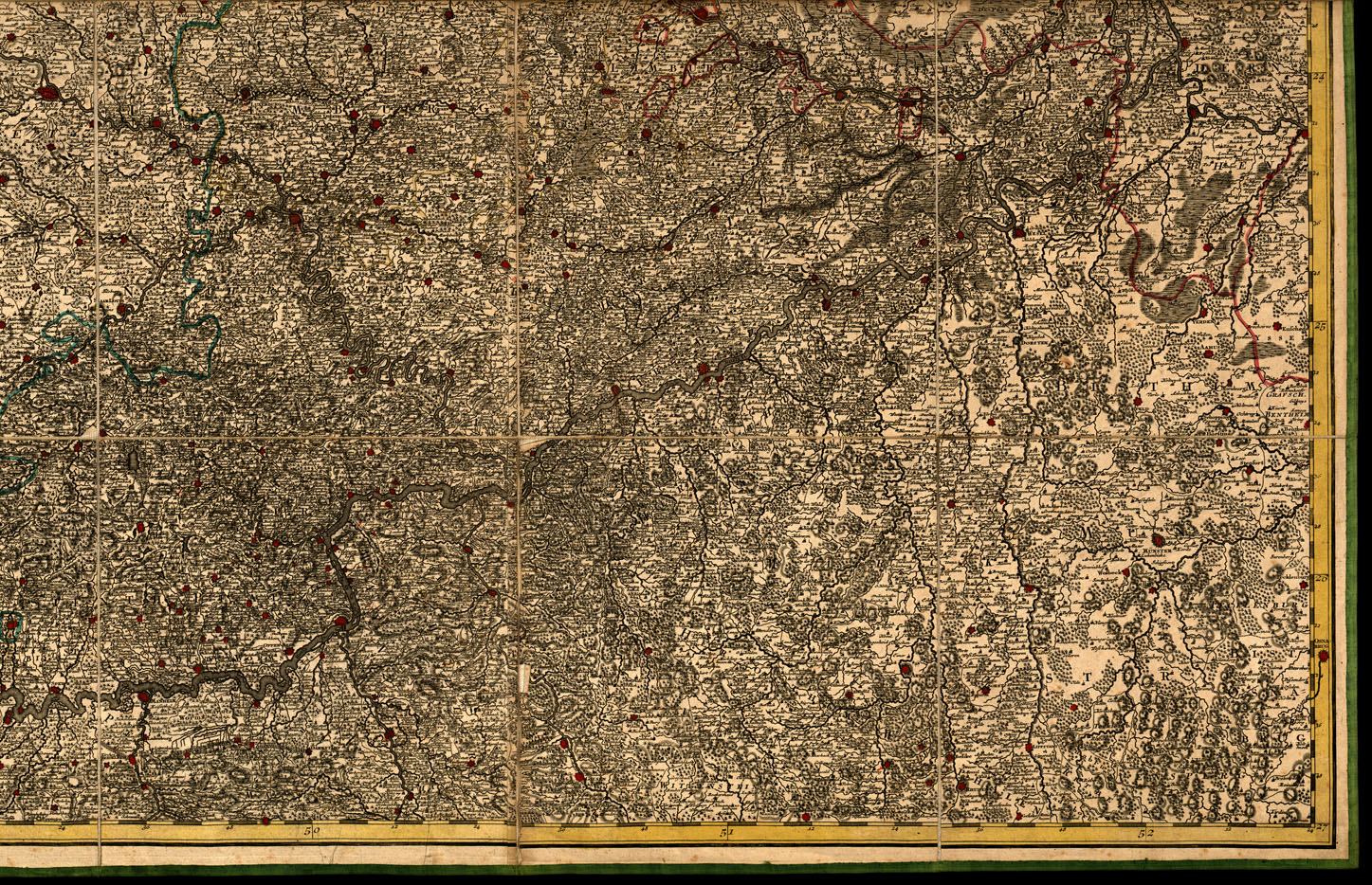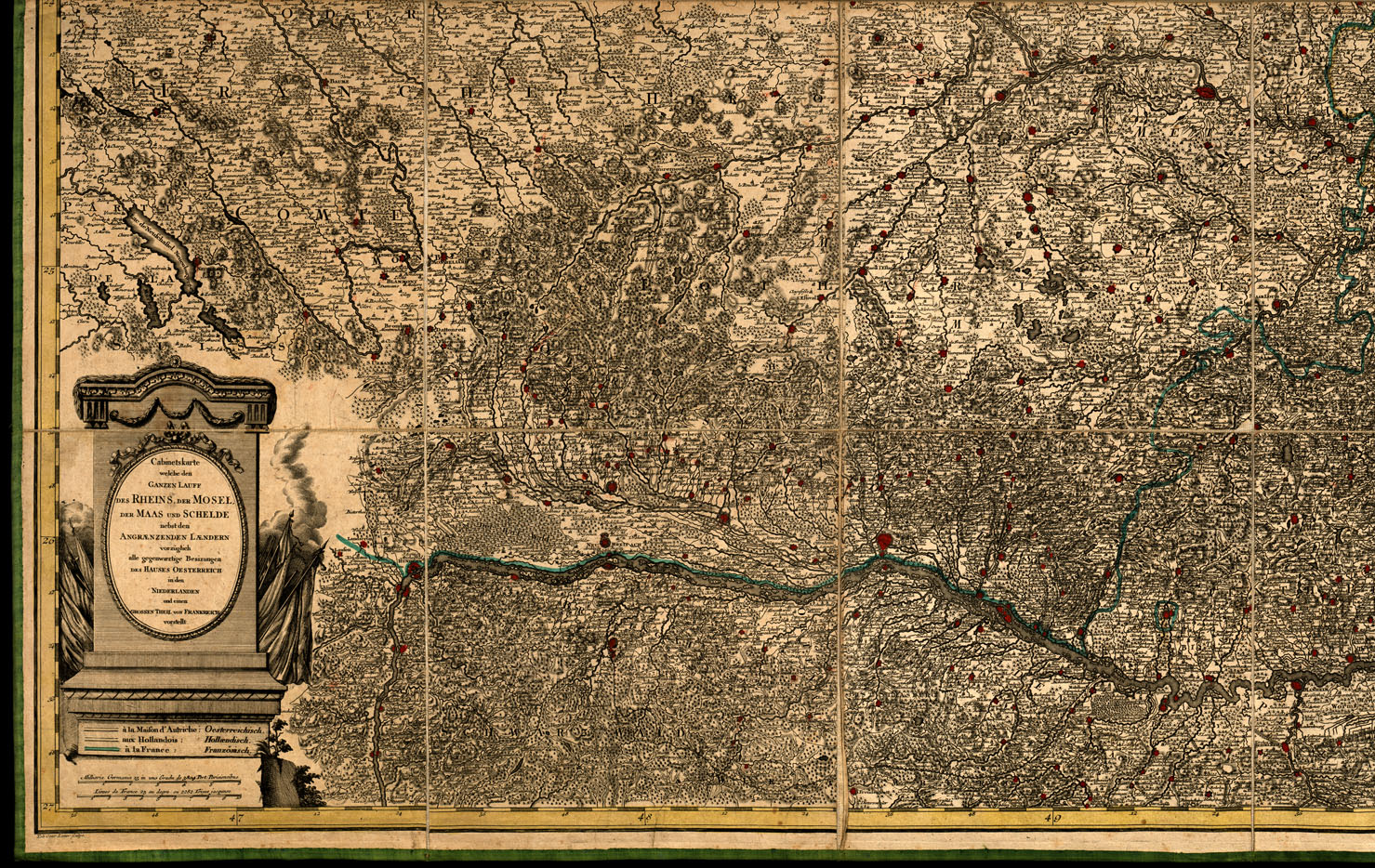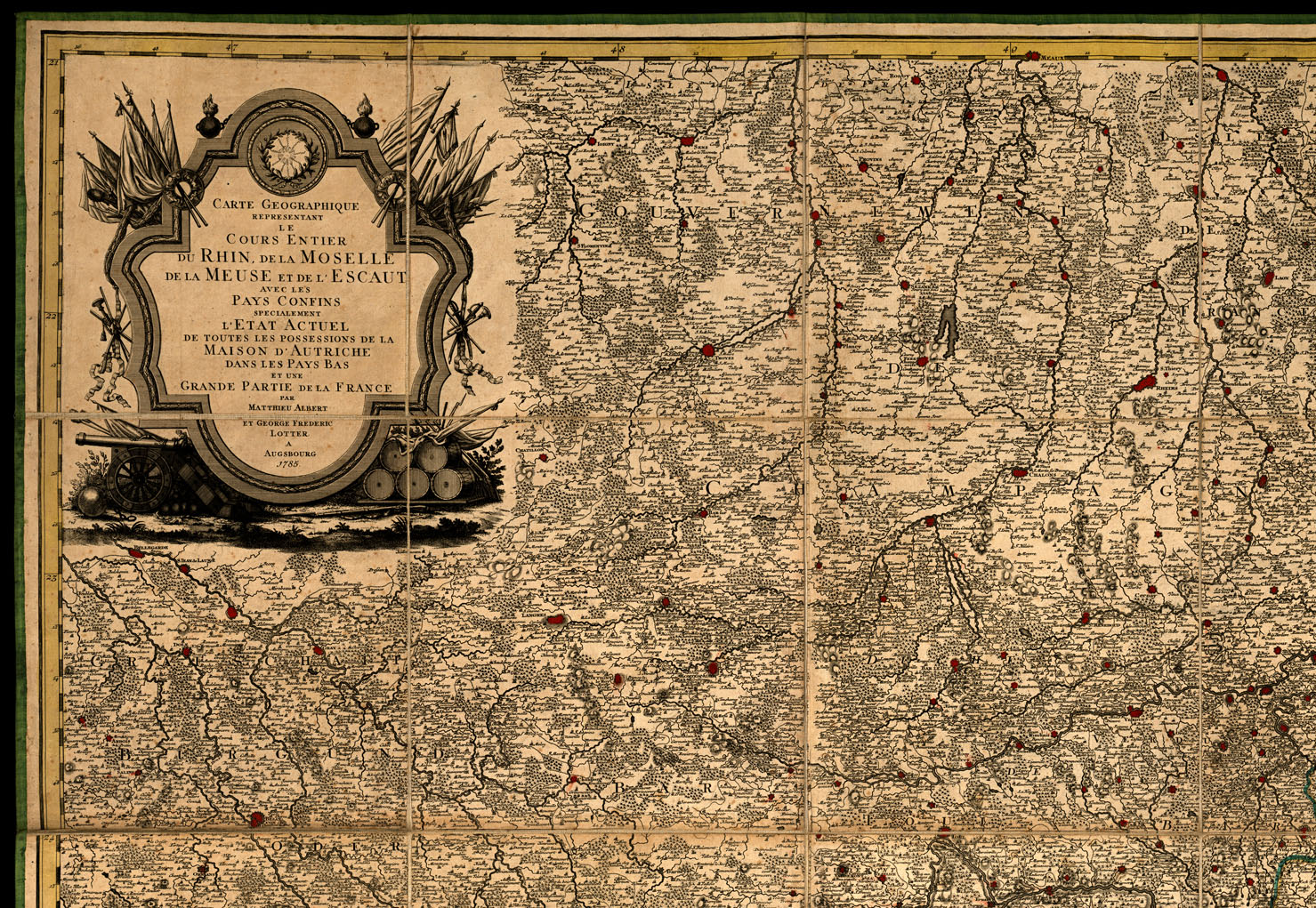 "De la Moselle - de la Meuse etde l'Escaut avec les Pys confins, specialment l'état actuel de toutes les possessions de la Maison d'Autriche dans les Pays Bas et une grande partie de la France - par Mattieu Albert et George Frederic Lotter à Augsbourg 1785. Incisione in rame eseguita da Lotter in 6 fogli riuniti su tela a stacchi Contiene due scale grafiche, 6 miglia geografiche di Germania, di 15 al grado, misurano mm. 111 il rapporto è di 1:400.000 circa. E' orientata col nord a destra le longitudini provengano dall'Isola del Ferro. I gradi del reticolato sono divisi di 12 in 12 minuti primi. L'orografia è rappresentata con tratteggio l'idrografia, i boschi e le paludi spiccano soverchiamente, generando confusione nella Carta anche per i troppi nomi che essa contiene. Le principali città sono colorate roso, tinte verdi e rosa pongono in evidenza i confini."