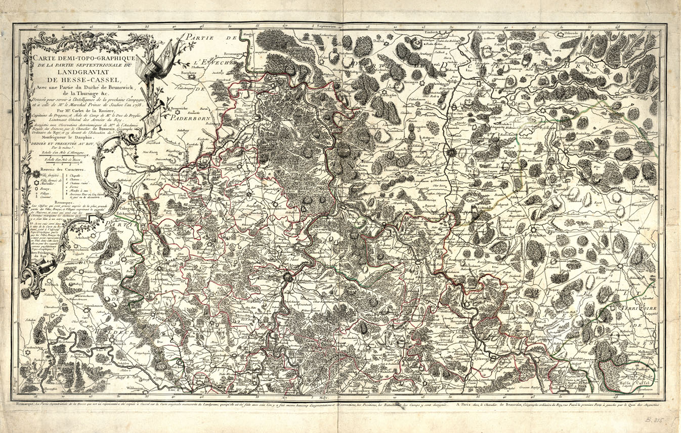 "Avec une partie du Duche de Brunswick, de la Thuringe, ecc. Dressée pour servir à l'intelligence de la prochaine Campagne, et à celle de Mr. le Marechal Prince de Soubise l'an 1758. Assujettie aux observations astronomiques de Mr. de l'Accademie Royale des Sciences, par le Chevalier de Beaurain, Géographe ordinarie du Roy, ecc. Carta del Landgraviato di Hesse-Cassel, con una parte del Ducato di Brunswich, della Turingia, ecc. anno 1759. Scala di 1:170.000. Incisione su rame in foglio unico. Sotto al titolo sono due scale grafiche in misure antiche, e le convenzioni circa le città fortificate, o recinte da mura o recinte da mura borghi, villaggi, conventi, cappelle, ecc. Le principali città, borghi e villaggi presentano il numero delle case che contengano. L'autore avverte che siccome gli abitati non hanno la pianta, ha creduto d'intitolare il disegno "Demi" con l'aggettivo "Topographique". Sotto alla carta, fuori cornice, sono notizie sui documenti dai quali essa proviene. L'orografia è fissata con tratteggio sono rappresentate le numerose foreste e la viabilità. Le longitudini provengano dall'Isola del Ferro. I confini sono determinati con coloritura."