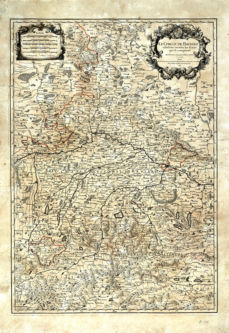"Par le Sr. Sanson, Geographe ordinaire du Roy a Paris 1690 circa. La data è incompleta, il lavoro appartiene alla fine del 1600. Sono delineate 5 scale grafiche in misure antiche, il rapporto è di circa 1:731.000. E' stato inciso su rame da Cordier, in un solo foglio. La carta contiene: idrografia, orografia (rappresentata a volo d'uccello) abitati e boschi. I confini spiccano per colori applicati con pennello. Le longitudini provengano dalle Isole di Capo Verde. Limiti: nord, Mylau sud, Brixen est, Mathausen ovest, Norlingen."