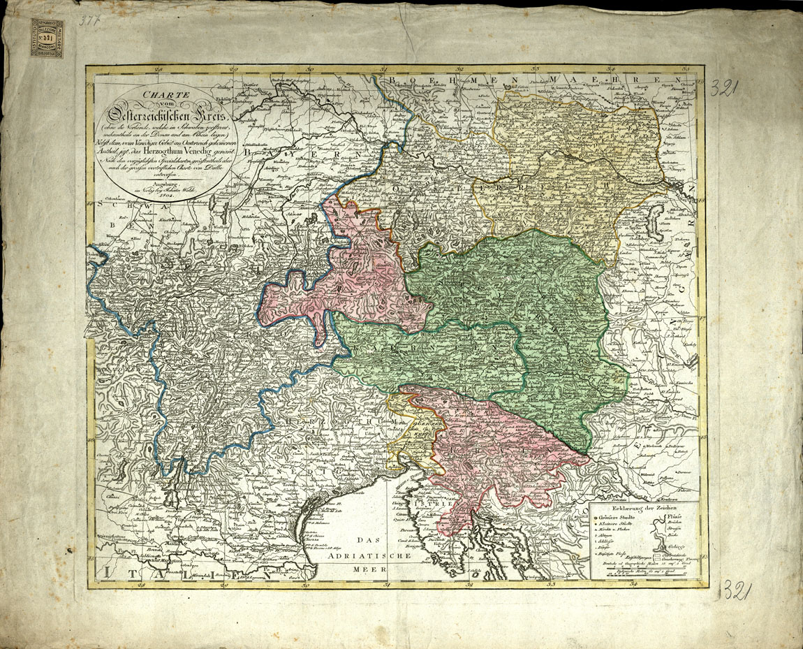 "Carta del territorio austriaco (senza i paesi del nord che sono sparsi per la più parte verso il Danubio) e con la parte di territorio veneto passato all'Austria, denominato ora Ducato di Venezia. Disegnato secondo le migliori Carte speciali, ma preponderatamente secondo la grande ottima Carta del Dalbe. Augusta, Casa editr. Giovanni Walch, 1802. Sono tracciate due scale grafiche un grado di latitudine misura 108 mm. Il rapporto è di 1:1.028.800 circa. E' incisa in rame in un solo foglio. Contiene poche strade. L'orografia è rappresentata con tratteggio che non disegna nettamente i displuvi. Le varie provincie sono velate con tinte diverse. Limiti: N. Boemia Corso del Po e. Ungheria O. Valtellina superiore. le longitudini provengano dall'Isola del Ferro."