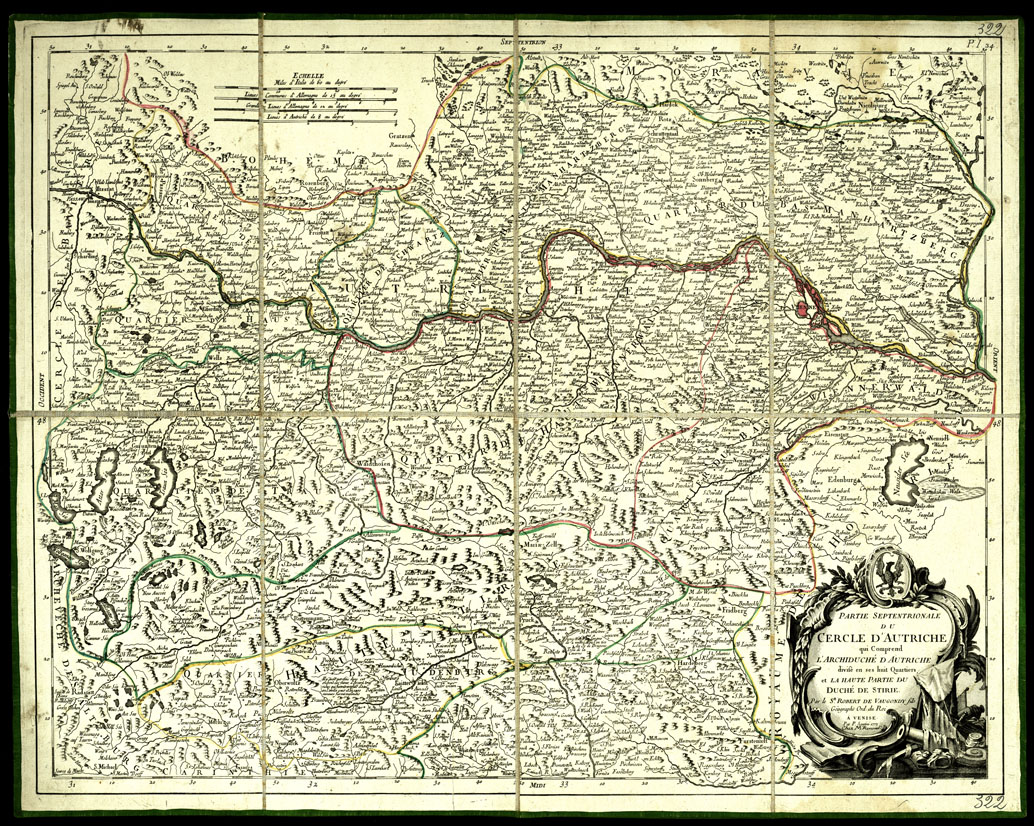 "Qui comprende l'Archiduché d'Autriche - dividé en ses Quartiers - et la Haute partie du Duché de Stirie - par le Sr. Robert de Vaugondy Fils - (Géographe ord. du Roi - à Venise), par P. Santini, 1777 chez Mr. Remondi. Nell'angolo nord-est è la sigla P. I. 34. Scala: 4 scale grafiche col rapporto all'incirca di 1:487.000. Carta incisa in rame in un solo foglio, è montata su tela a stacchi. Contiene: idrografia, orografica rappresentata a volo d'uccello, abitati, nessuna trccia della viabilità, confini amministrativi, miniere nei margini sono indicati meridiani e paralleli. L'orientamento è normale. Limiti: N - Pohrlitz, S - Fernitz, E - Hainburg, O - Man Sée. Le longitudini provengano dall'isola del Ferro."