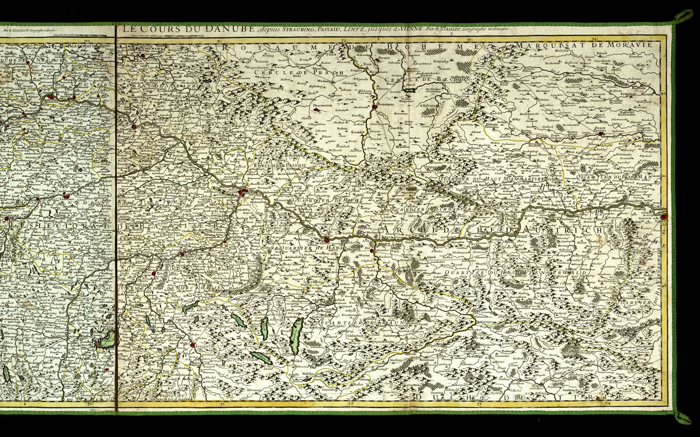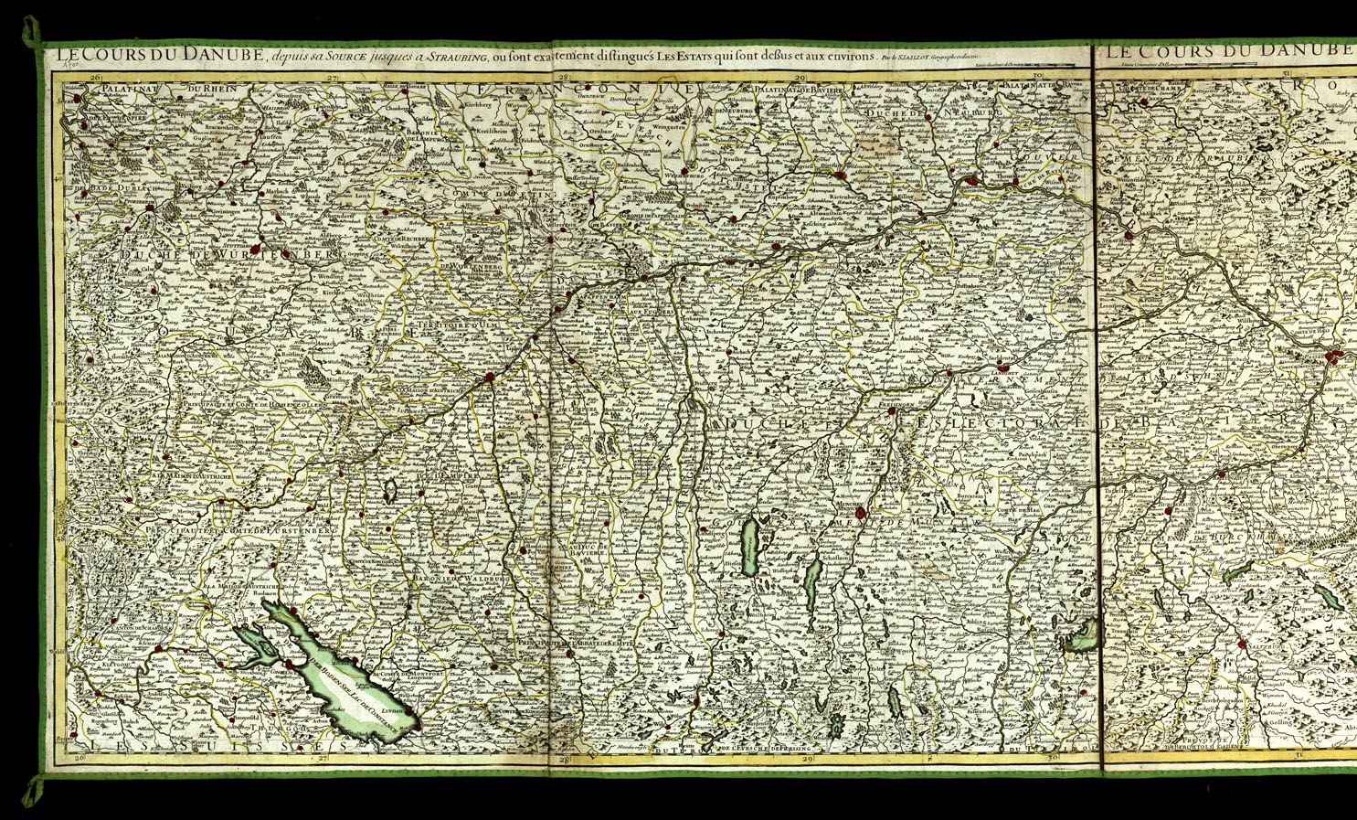 "Ou sont exactement distingués les Etats qui sont dessus et aux environs. Par le Sr. Jaillot Geographe ordinaire. Carta incisa in rame in solo foglio. Sono delineate le sorgenti del grande fiume, situate sotto la bene rappresentata "Montagne de Torner" e precisamente nella località "Doneschingen". La carta non ha data, ma essa appartiene al secolo XVII. Contiene: le vie rotabili principali, l'idrografia, l'orografia rappresentata a volo d'uccello, gli abitati in prospettiva, le foreste la toponomastica è in francese. Sono segnati nei margini i valori dei meridiani e dei paralleli. Le longitudini provengano dall'Isola del Ferro. Accanto a questo foglio ne è altro a destra, col seguente titolo: "Le Cours du Danube, depuis Straubing, Passau Lints, Jusques à Vienne", è riunito su tela, lasciando uno stacco fra i due disegni."