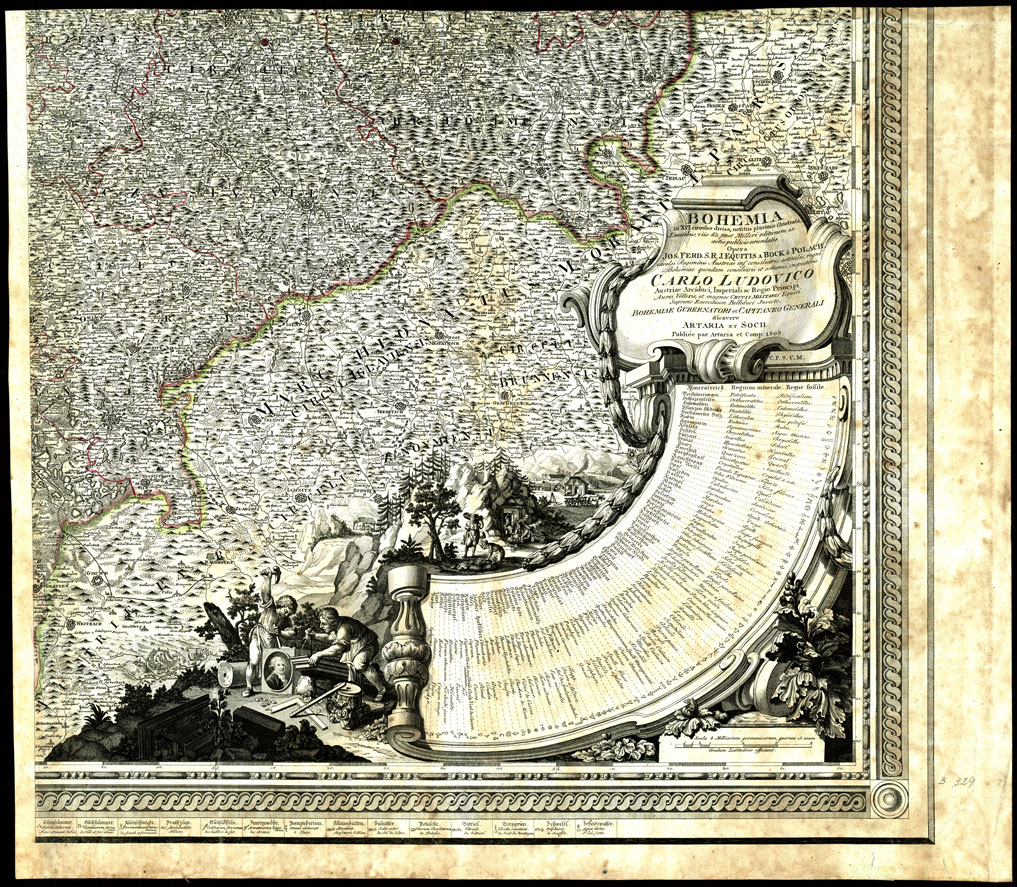 "Comitatu Glacensi et Districtu Egrano. Vienna, Artaria e C., 1808. Scala grafica di 4 miglia germaniche di 15 al grado, che misura 86 mm. Il rapporto è di 1:344.560 circa. Carta incisa in rame in 4 fogli riuniti, dedicata a Carlo Ludovico Arciduca d'Austria. Ricca cornice trovasi incisa fuori del campo disegnato, nei due angoli superiori sono rappresentate artistiche allegorie, in quelli inferiori sono varie notizie. A destra, sotto la dedica, è la spiegazione degli 85 segni usati per indicare minerali e fossili a sinistra sono segni convenzionali per spiegare i particolari contenuti nella carta e sotto a questi segni ve ne sono altri che distinguano la produzione dei vari stabilimenti industriali. La carta è bene incisa, ma confusa per il forte ombreggiamento applicato ai fittissimi coni che rappresentano l'orografia e per i troppi svariati segni che contiene i nomi sono illeggibili senza l'aiuto della lente. Orientamento normale, le longitudini sono riferite all'Isola del Ferro."