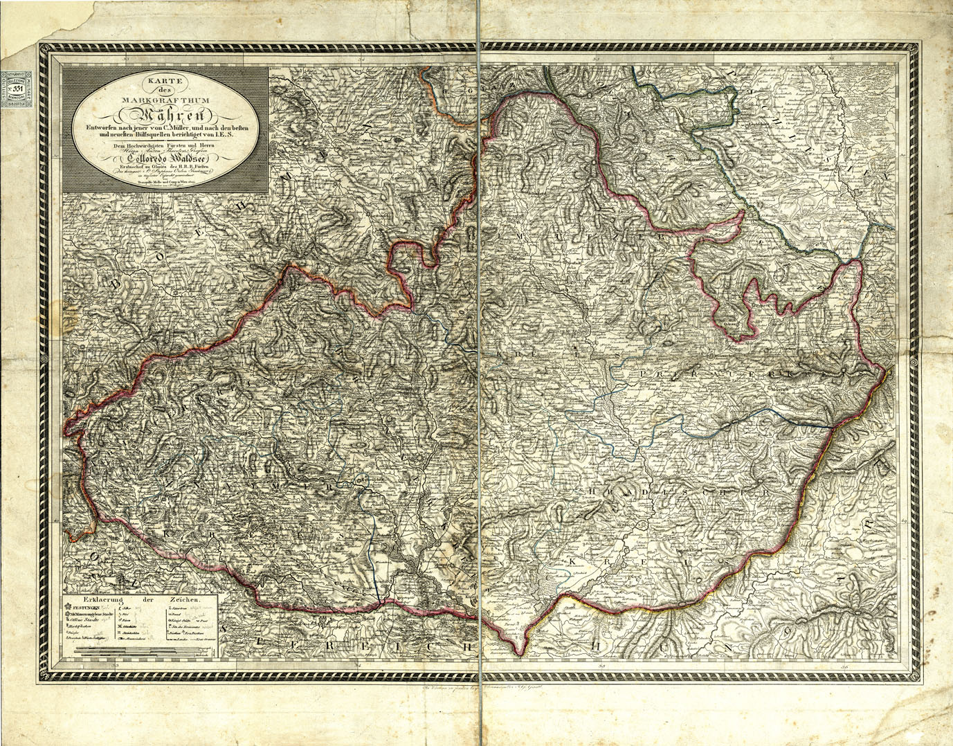 "Carta del Margraviato di Moravia disegnata su quella di C. Muller ed aggiornata secondo le migliori e più recenti fonti da I.E.S. dedicata al principe e signore Antonio Teodoro Conte Colleredo Waldsee, Arcivescovo di Olmutz, principe del Sacro Romano Impero, etc. edita in Vienna nel 1809 da Tranquillo Moro e C., incisa in rame da F. Reisser. E' in due fogli riuniti. Contiene tre scale grafiche un grado di meridiano misura 337 mm., il rapporto è di 1:330.000 circa. Le longitudini provengano dall'Isola del ferro. Limiti: N. G. Glatz - S. Hungarn - E. Olenza - O. Konigseck. E' segnata la rete stradale, gli abitati, l'idrografia, le foreste l'orografia è rappresentata con tratteggio delineato senza alcun metodo, non spiccano i displuvi. I confini sono ripassati con pennello e distinti con vari colori. Questa carta è una posteriore edizione di quella descritta al N. 38 d'ordine in questa l'orografia è più evidente, sebbene lasci a desiderare."