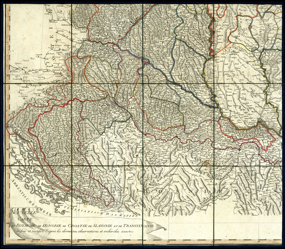 "Croatiae, Sclavonia-Necnon-Magni Principatus Transylvania-Juxta adcuratissimas observatione Adhibitisque-Certissimis veritatis fontibus descripta, ecc., dedic.all'Arciduca d'Austria Alessandro Leopoldo, dalla "Societatis Artarianae". Vienna, 1803. Scale: tre scale grafiche 15 miglia geografiche corrispondenti ad un grado di lat. misurano 160 mm. Il rapporto è di 1:700.000 circa. La carta è in quattro fogli montati separatamente su tela a stacchi incisa su rame da F. Muller. L'orografia è rappresentata a volo d'uccello con linea sottile è indicata la viabilità fra i centri più importanti i paesi sono fissati con segni circolari, le città figurano prospetticamente non mancano le foreste. Con colori applicati con pennello lungo i confini sono distinti i territori, i quali hanno richiamo nella leggenda che è nel foglio II. Nel foglio IV sono segni convenzionali."