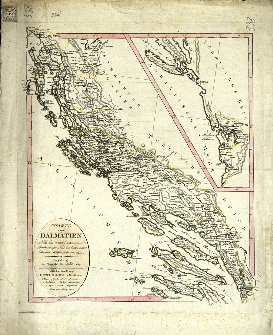 "Edita da Giovanni Walch, 1807. Scala: un grado di meridiano misura 204 mm. Il rapporto è di 1:544.661 circa. Limiti: N. Castua - S. L. Lagosta - E. Croazia - N. Isole Canidole. Nell'angolo nord-est è il proseguimento della costa Dalmata da Sabbioncello a Ragusa ed oltre Budua. E' incisa in rame e costrutta secondo le più recenti determinazioni astronomiche ed i migliori dati conosciuti. I segni convenzionali rappresentano: città, fortezze, borgate, conventi, villaggi, castelli, stazioni di posta, arcivescovadi, seminari, porti, saline, vie principali, vie postali e confini della regione."