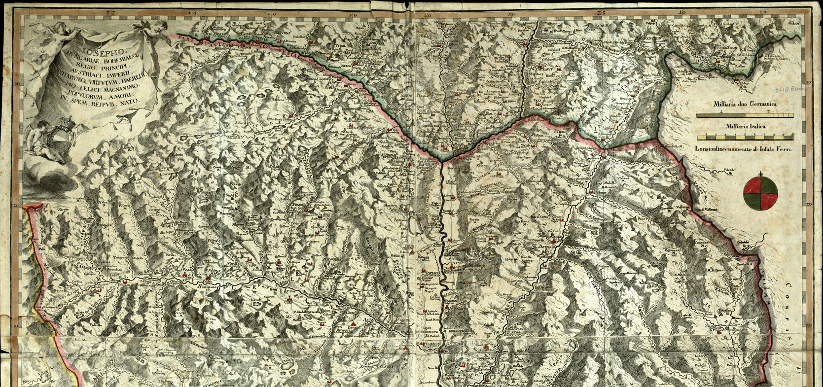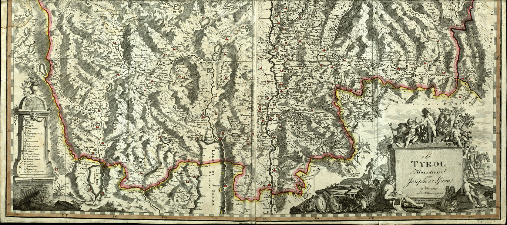 "Ded. a Josepho Hungariae, ecc. Due scale grafiche, il rapporto è di 1:119.530 circa. Il titolo giace nell'angolo sud-ovest fra artistica allegoria, nella quale sono stemmi delle principali città del Tirolo. Le longitudini provengano dall'isola del Ferro. Orientamento normale. Carta incisa in 4 fogli. L'orografia è rappresentata con tratti incrociati, luce obliqua pura di 45° proveniente dall'angolo nord-est della carta. Il reticolato presenta sensibili differenze nella divisione dei gradi. Sono indicate le principali strade, l'idrografia è delineata imperfettamente, il lago di Levico figura più piccolo del Lago di Coldonazzo. Limiti: N. Schlander in Val Venosta e Layon in Val d'Isarco, S. Campion F. e Brentino, E. Territoeio di Feltre, O. Tonale e Valcamonica."