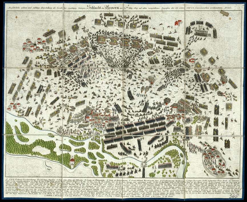 "Und richtige Darstellung der beruhmten zweitagig blutigen Sclacht bei Aspernam 21 ten Maj 1809 mit allen Vorgefallenen Angriffen der K.K. oster und K:K: franzosischen Verbundeten Armèe. Carta in due fogli separatmente montati su tela e colorati a mano sull'incisione in rame. Rappresentano fedelmente ed esaurientemente la celebre sanguinosa battaglia di "Aspern" durata due giorni. Il foglio n°1 rappresenta la giornata 21 marzo 1809, e descrive tutti gli attacchi dell'esercito austro-ungarico e degli eserciti associati francesi. Il foglio N. 2 descrive la seguente giornata del 22 maggio 1809."