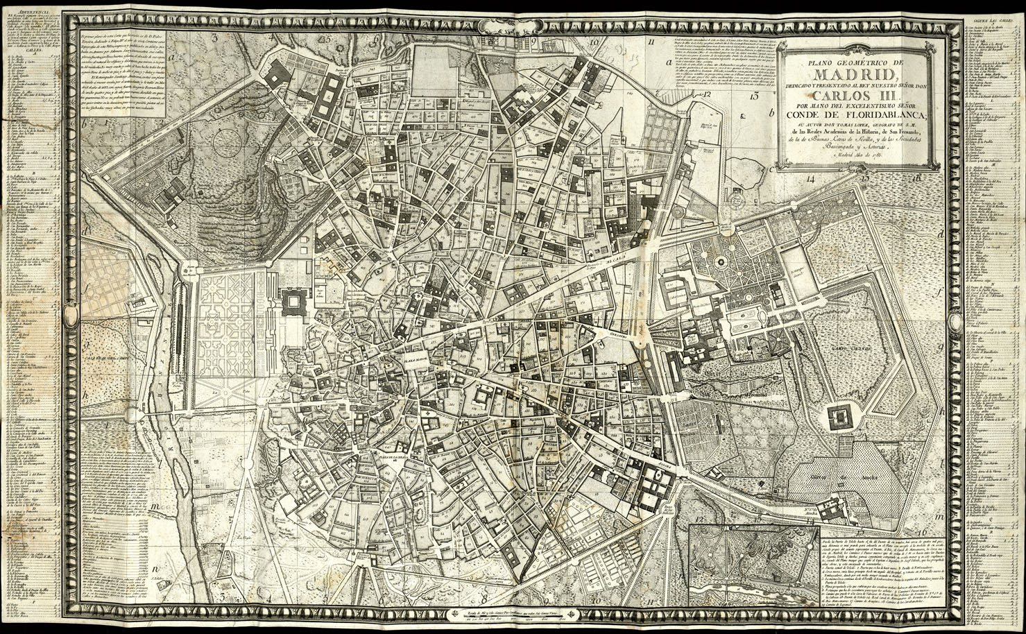 "Dedicado y presentando al Rey nuestro Senor Don Carlos III por mano del Excelentisimo Senor Conde de Floridablanca, su autor Don Tomas Lopez, Geografo di S.M., ecc. Scala grafica in "Pies Castllanos" corrispondenti al rapporto di 1:5.600 circa. Madrid. - Tomas Lopez, 1785. - Si compone di un foglio. Il disegno è inclinato verso ovest. E' stampato in nero da incisione su rame. Agli angoli del foglio sono poste delle discrezioni di piante della città di Madrid anteriori a questa. Lungo i margini laterali del foglio e fuori del campo disegnato sono elencate le vie e piazze della città. E' molto particolareggiata e ben disegnata."