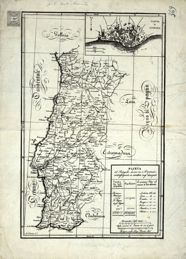 "Divisa in cinque provincie, costruita nella litografia Cipriani e comp. Bologna presso Luigi Rocchi, libraio. Proviene da autografia calcata poco bene sulla pietra litografica. E' in foglio unico monocromo. Orientamento normale. contiene la scala grafica in leghe com. di Francia di 25 al grado di lat. misura 77 mm., il rapposrto è di 1 a 1:443.000 circa. Le longitudini provengano dall'isola del Ferro. La toponomastica è in portoghese e presenta sufficiente numero di vocaboli. La planimetria ha gli impluvi poco accurati mentre la rete stradale è ben tracciata. L'orografia è appena accennata da una serie di piccoli coni tratteggiati nella parte in ombra. Nell'angolo nord-est è la pianta della Città di Lisbona alla scala di 1 a 48.800 circa. Sotto ad "Estremadura", nell'angolo sud-est, è una tabella contenente dati statistici e la superficie del Portogallo."