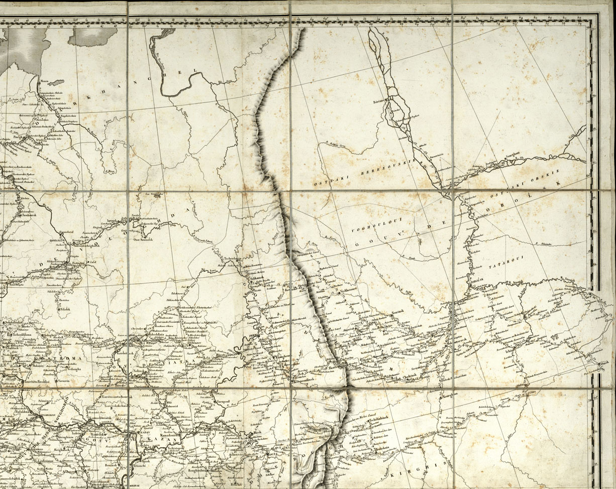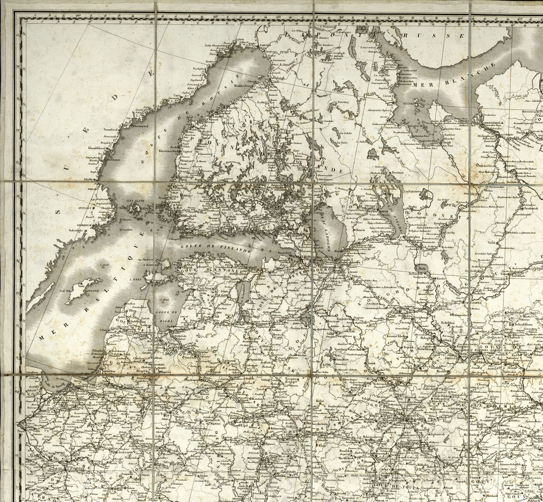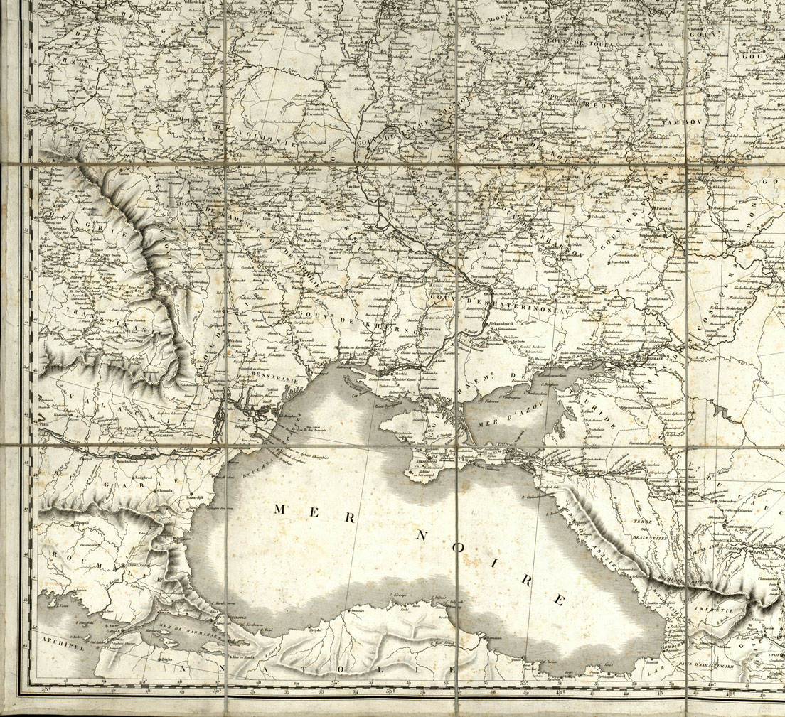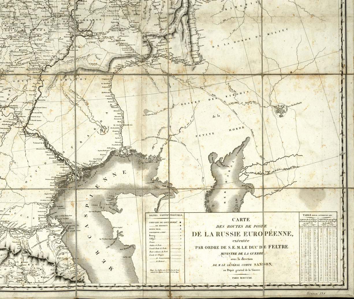 "Executée far order de S.E. le duc de Feltre Ministre de la Guerre sous la direction de m. le Gènéral comte Sanson, au Depot Général de la Guerre Paris. E' incisa su rame in 4 fogli riuniti su tela a stacchi. Il rapporto desunto da un grado di meridiano, che misura 444 mm. è di 1:250.000 circa. Orientamento normale. Limiti: nord, Lapponia e Mar Bianco sud, Anatolia e Mar Caspio est, Tara-Omsk ovest, Mar Baltico e Vidin. Le vie postali rappresentano con due linee, presentano cifre che fissano le distanze in leghe di 25 al grado. Nell'angolo sud-est è la tabella per il passaggio dalle misure in leghe alle verste. L'orografia è espressa con artistico tratteggio a luce obliqua sono segnate le dorsali dei Carpazi, degli Urali, e del Caucaso. I valori delle longitudini scritti superiormente sono riferiti al meridiano di Parigi, e sotto abbiamo la graduazion e proveniente da Greenwich."