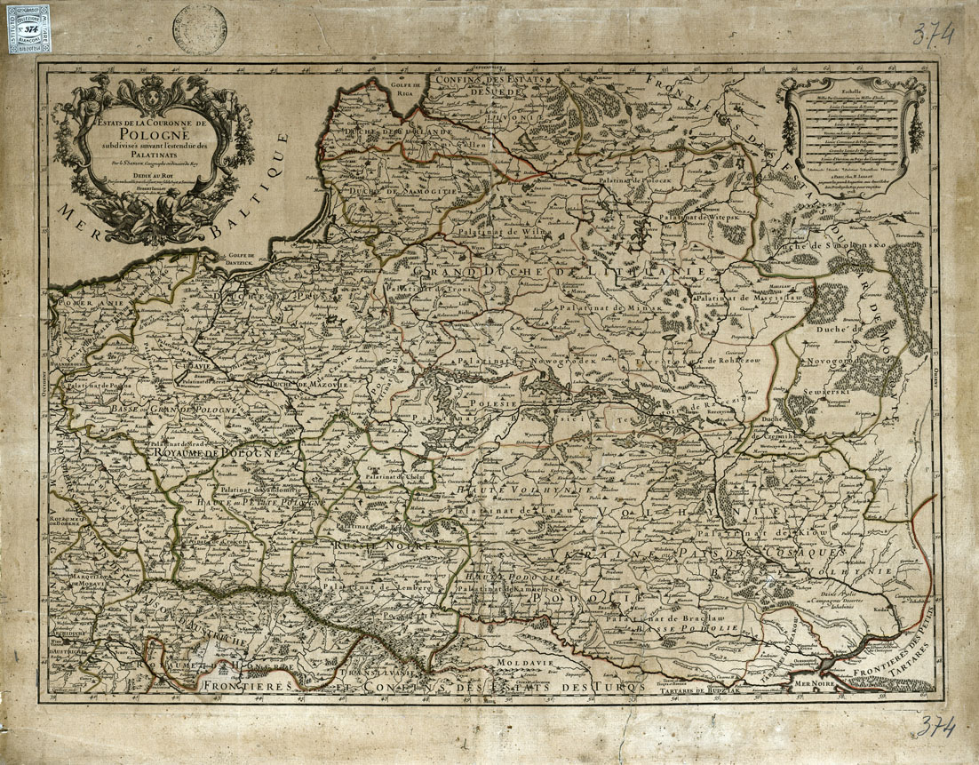 "Subdivisés suivants l'estendue des Palatinats par le Sr. Sanson, Géographe ordinaire du Roy dedié au Roy par Hubert Jaillot Géographe de sa Majestà Paris. E' incisa su rame in foglio unico montato su tela. Contiene l'orografia rappresentata a volo d'uccello, l'idrografia e gli abitati. La toponomastica è in francese sono segnate le vie principali solamente nelle seguenti regioni: Russie Noire, Ukraine, Pedolie, Basse Pedolie, e nella Tartarie. Le longitudini provengano dall'isola del ferro. Sono tracciate 8 scale grafiche in misure antiche."