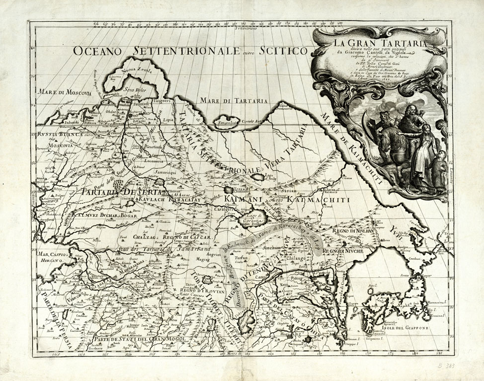 "Divisa nelle sue parti principali da Giacomo Cantelli da Vignola, conforme le relazioni che s'hanno da gl'Itinerarij de' P.P. della Comp. di Gesù, di Monsu' Tavernier e delle raccolte di Monsù Thevenot, data in luce da Gio. Giacomo de Rossi in Roma, alla Pace, con priv. del S.P. l'anno 1683. Il rapporto metrico, desunto dai valori della graduazione, è di 1:13.877.000 circa. Il valore di questa carta va considerato tenendo conto della data di costruzione (1683), quando scarse e incerte erano le notizie geografiche pervenute nei centri di cultura della Regione Tartara e dal Giappone. Non si può pertanto muovere appunti al Cantelli per l'erroneo orientamento della parte orientale del mar Caspio, della penisola di Corea, delle isole Nipponiche e per la deformazione dell'idrografia. Incisione su rame in foglio unico. Limiti: nord, Oceano settentrionale sud, isole del Giappone est Terra di Iesso ovest, Russia Bianca, Mar caspio, parte della Persia. L'orografia è figurata a volo d'uccello la toponomastica è in italiano."