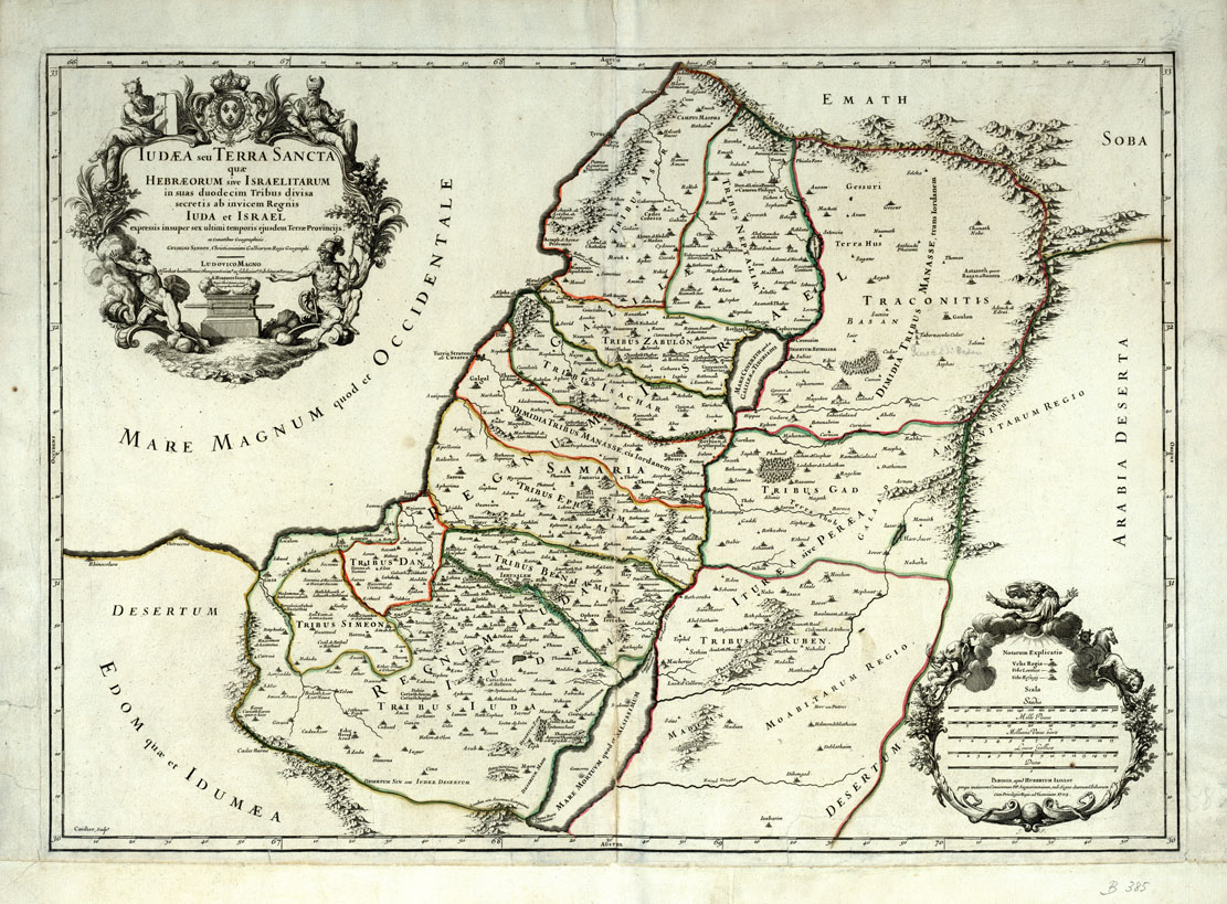 "Quae Hebraeorum sive Israelitarum in suas duodecim Tribus divisa secretis ab invicem Regnis Iuda et Israel espressis insuper sex ultimi temporis ejusden Terrae Procincijs. Ex Conatibus Geographicis Guglielmi Sanson, Cristianissimi Galliarum Regis Geographi Ludovico Magno Offerebat humillimus, obsequentissim. ° ac fidelissim à subditus, et servus A. Hubertus Iaillot Regis Cristianissimi Geographus Ordinari. Parisiis, apud Hubertum Jaillot, ecc., 1709 Cordier, sculp. E' incisa su rame in un solo foglio. Contiene: i luoghi abitati, divisi in Urbs Regia, Urbs Levitica, Urbs Refugij. Sono tracciate 5 scale grafiche. l'orografia è segnata a volo d'uccello. nella "Tribus Gad", sulla sinistra del Giordano, è delineata la foresta denominata: "Saltus Ephraim" ad oriente del "Mar Cenereth" è altra foresta detta: "Quercus Basan"."