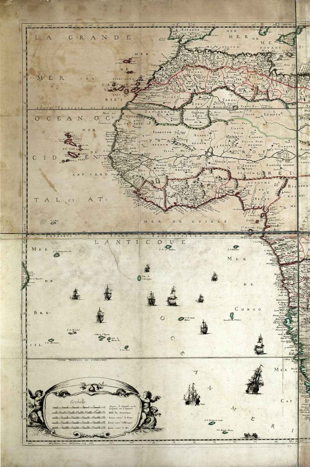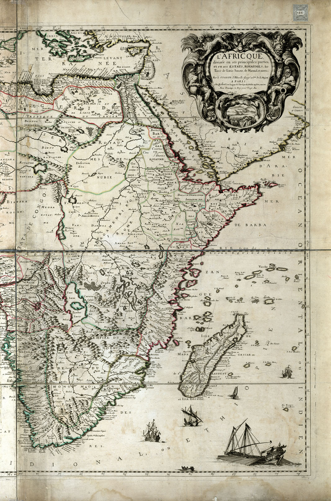 "Divisée en ses principales parties et en ses etats, Royaumes etc. Tirée de Livio Sanuto, de Marmol, et autres Par le S. Sanson d'Abbeuille Geogr. ord de Sa Majéstè. A Paris, chez Robert sur le Quay de l'Horloge du Palais au fort Sanson avec privilége du Roy pour Vingt ans. 1700 circa. Carta accuratamente compilata, incisa su rame in 4 fogli da Johannes Somer Pruthenus. L'orografia è figurata a volo d'uccello. La toponomastica presenta voci in latino ed in francese. Sono segnati i boschi principali, i paesi sono prospettici. Le longitudini provengano dalle Isole del Ferro. La carta è montata su tela in quattro stacchi. Contiene cinque scale grafiche in misure antiche."