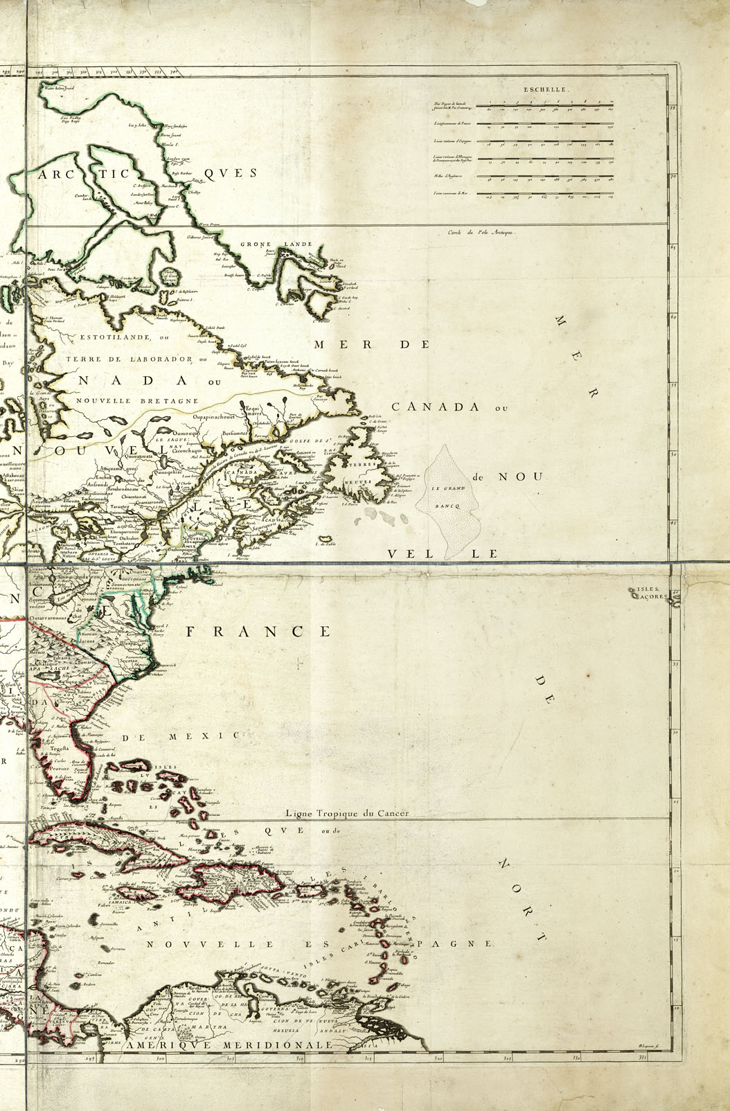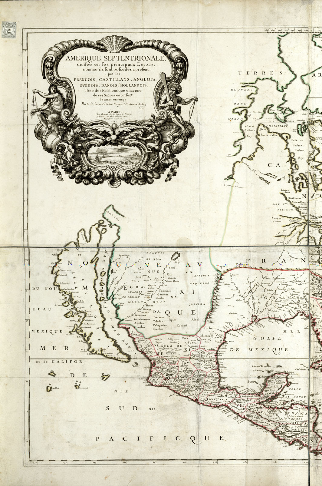 "Divisée en ses principaux Estats, comme ils sont possedes a present, par les François Castillans, Anglois, Svedois, Danois, Hollandois, Tirée des relations que chacune de ces Nations en ont faict de temps en temps, par le S. Sanson d'Abbevs Geogra. Ordinaire du Roy. A Paris chez Robert, ecc., 1715. Grande carta incisa su rame da "D. Lapointe fe" E' in quattro fogli riuniti. Limii: nord, les 3 isles sud, Gol. de Panama est Isles Açores ovest, Calieornie isle. Il reticolato presenta notevoli differenze fra le suddivisioni dei gradi nei lati est e ovest della carta poca precisione è anche nelle scale grafiche. L'orografia è rappresentata a volo d'uccello: la toponomastica è prevalentemente in francese con nomi tedeschi e spagnoli."