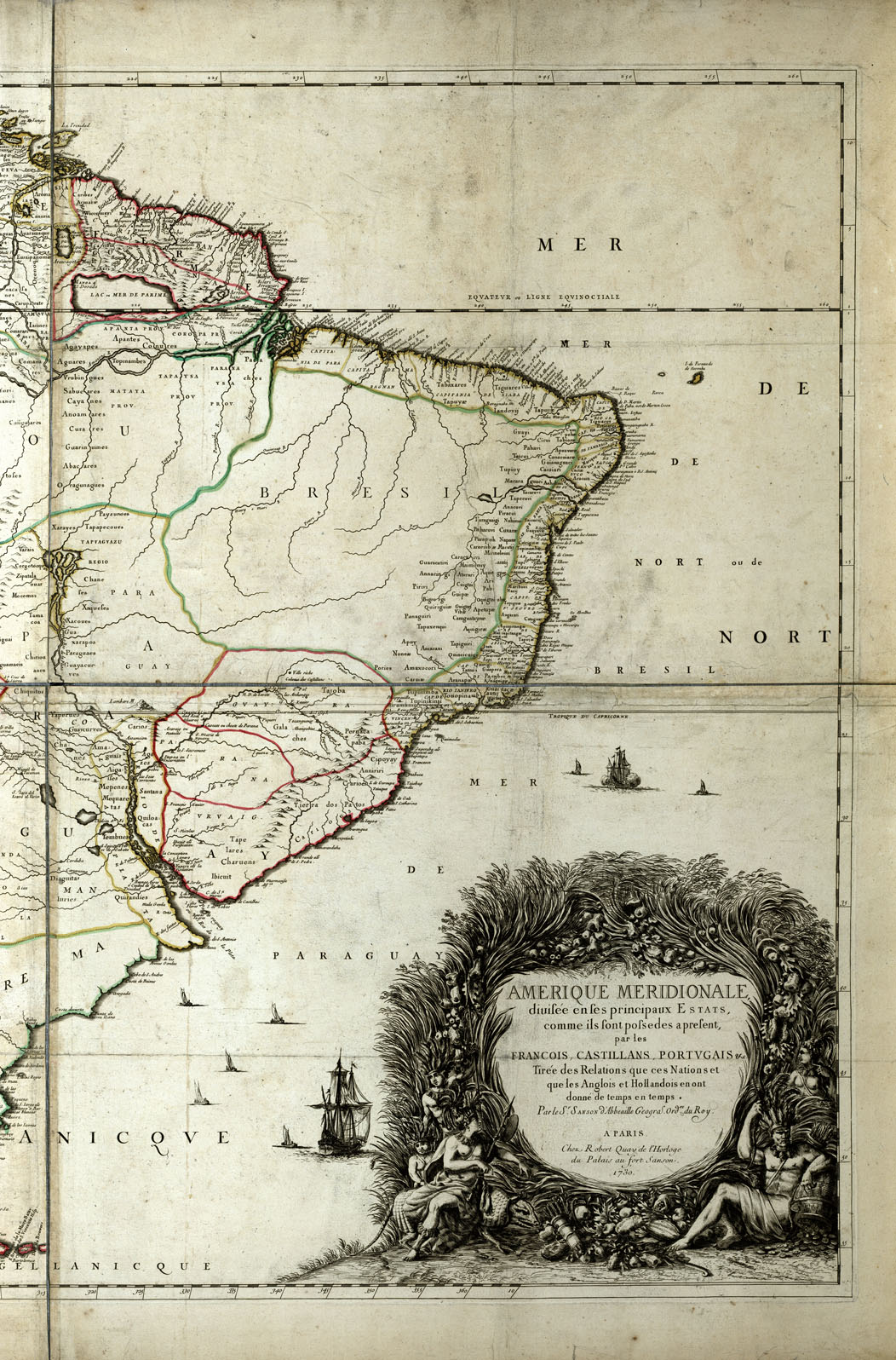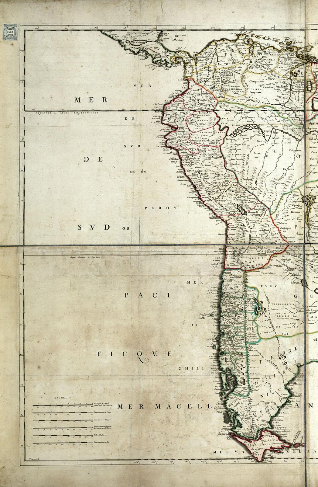 "Divisée en ses principaux Estats, comme ils sont possedes a present, par les Francois, Castllans, Portugais tirée des relation queces Nations et que les Anglois et Hollandois en ont donnée de temps en temps. Par le S. Sanson d'Abbeuille Geogra. ord du Roy. a Paris chez Robert, ecc., 1730. E' il proseguimento della precedente carta 388, costruita alla medesima scala dallo stesso A. anche questa in quattro fogli riuniti."