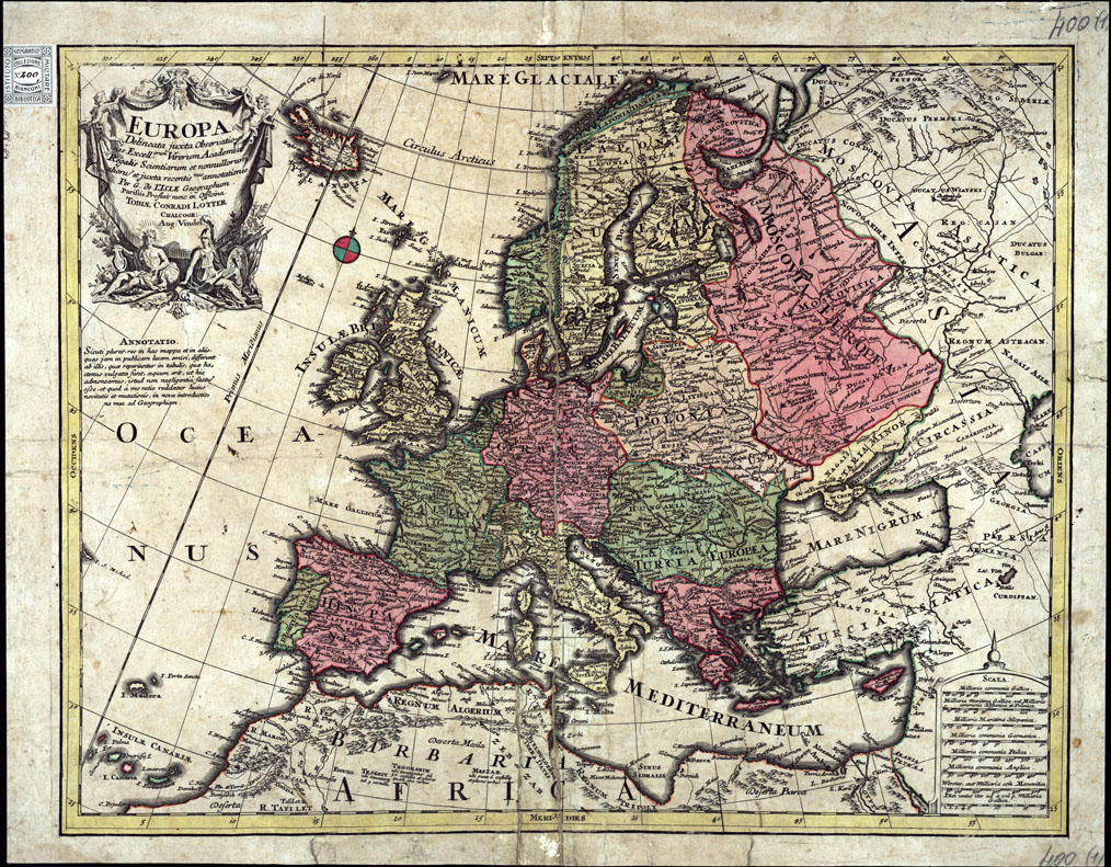 "Carta n. I Europa delineata da G. de l'Isle. La proiezione è la conica equidistante meridiano è il 30° situato al centro del disegno le longitudini provengano dall'Isola Islanda che giace a ovest della Carta. Il disegno si estende 90° verso est, 35° a sud, ed oltre 70° a n ord. Il calcografo Lotter avverte che le sue tavole particolari, provenienti da questa carta generale, presentano alcune divergenze che egli spiegherà nel testo geografico."