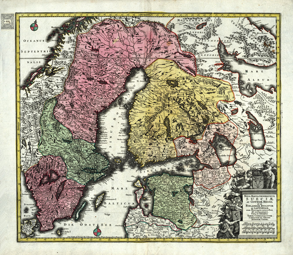 "( Mappa della Svezia col Regno di Gotha, Finlandia, Lapponia. Autore della carta è Tobia Corrado Lotter. Sono tracciate tre scale grafiche in misure antiche. La proiezione adottata è la conoca equidistante. Epoca 1760 circa. Le longitudini provengano dall'Isola del Ferro."