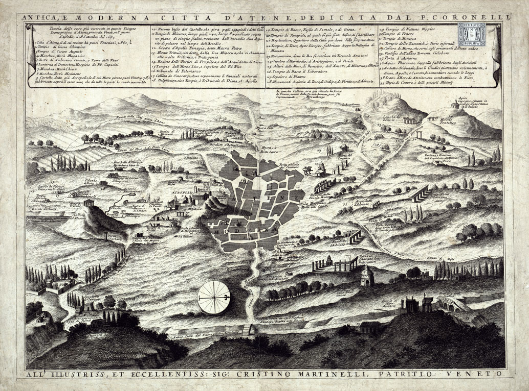 "Iconografia rilevata dagli assediati il 28 settembre 1687. Pianta prospettica della zona antica, geometrica dell'Atene moderna, che giace al centro del foglio incisione su rame dedicata dal geografo P: Corelli al patrizio veneto Cristino Martinelli. Il disegno, eminentemente artistico, è orientato col nord a destra del foglio lavoro interessante per compisizione accurata sotto l'aspetto archeologico e per le chiare leggende espicative situate accanto ai monumenti. Impressa su carta Bambagia"