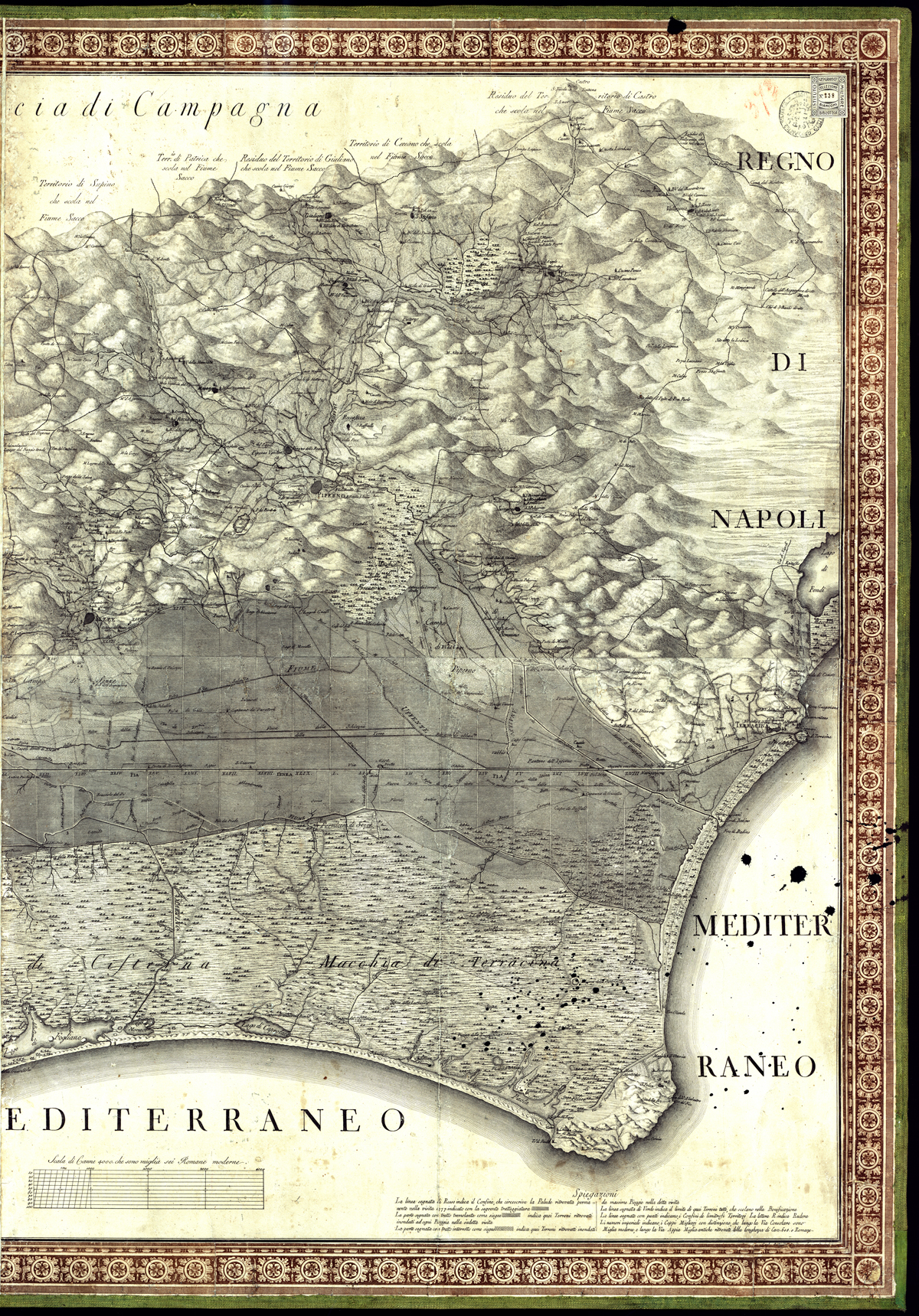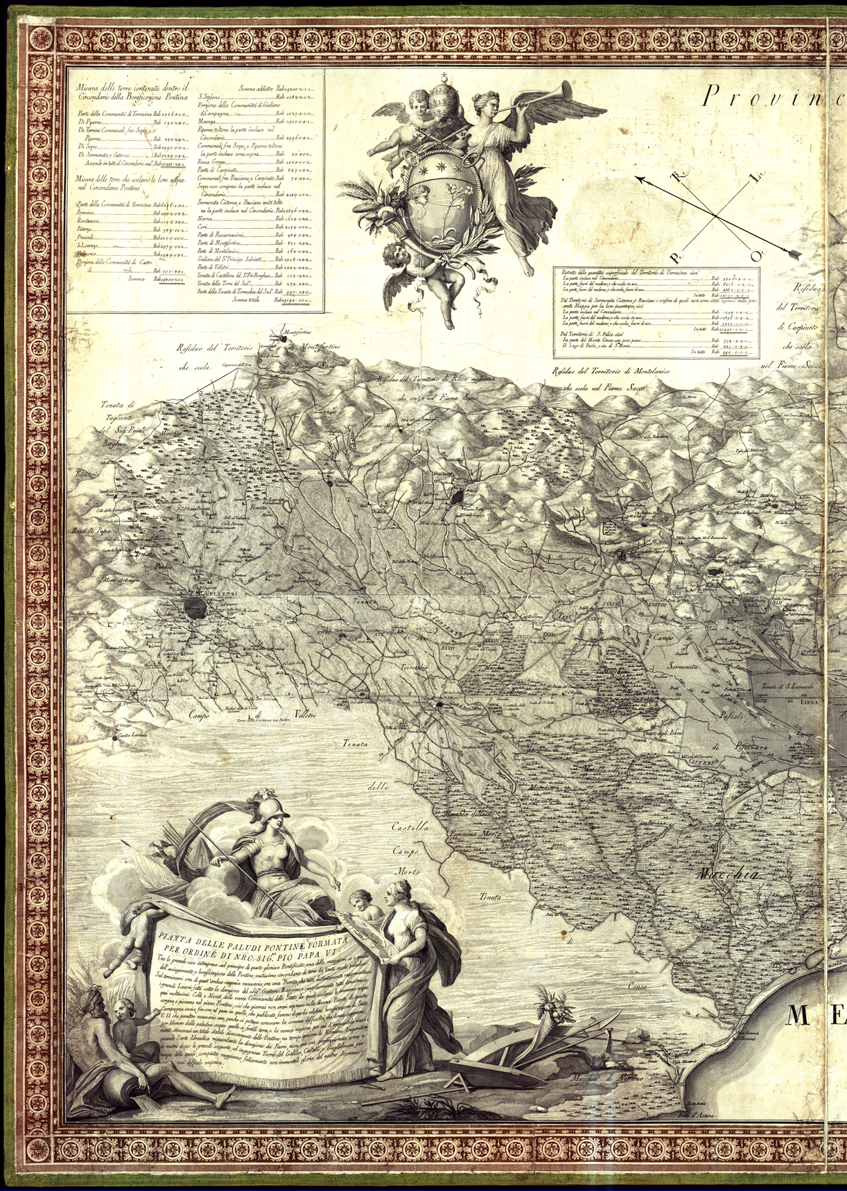 "Bella, interessante carta incisa su rame in due fogli. Rilievo e disegno di Gaetano Astolfi. Incisore Carlo Antonini della Calcografia Cameraole. La carta si riferisce ai lavori idraulici compiuti dall'Ing. G. Rappini per la bonifica delle Paludi. Orientazione: il nord è spostato a sinistra. Orografia prospettica. Il foglio sud-occidentale contiene la dedica a Papa Pio VI sotto il cui pontificato si compirono tale lavori il foglio nord occidentale reca i dati relativi alla superficie dei terreni il foglio sud orientale la leggenda dei segni convenzionali circa lo stato di sommersione dei terreni quale riscontrata durante l'ispezione e la scala geografica in canne. Alla carta sono annesse sei tavole con vedute, incisioni di Fr. de Capo e C. Antonini. Una delle tavole contiene la pianta del Porto di Terracina. Due copie, una delle quali in fogli riuniti in quadro unico e montati su tela. Cfr. Arrigoni e Bertarelli. Le carte geografiche dell'Italia, ecc. N°2149 L'altra copia su quattro fogli è alla collezione Camerale n.576"