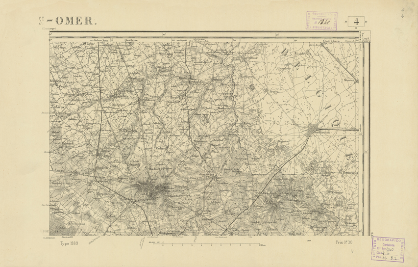 "Paris. Service Géographique de l'Armée, 1889. Ebbe origine dall'Edizione zincografica in quarti di foglio, stabilita dal 1879, per la carta detta de "L'Etat-Major". Infatti non rispondono più il sistema della riproduzione zincografica alle esigenze che la revisione dei fogli imponeva, per un inevitabile logoramento dei rami originali, fu proposta dapprima la correzione degli zinchi, ma questo, importando un lavoro lungo e gravoso, si adottò il procedimento galvanico. I rami galvanici ottenuti e corretti secondo questo sistema presero il nome di "édition type 1889". Allo scopo di facilitare l'incisione fu adoperata la suddivisione in quarti di foglio come per l'edizione zincografica. La revisione dei fogli di questo tipo non fu iniziata che nel 1893. Dal catalogo del S.G.A. risultano mancanti a questa edizione i dipartimenti della "Moselle", del "Bas-Rhin" e del "Haut-Rhin" per i quali non esiste che una edizione in fogli interi aggiornata nel 1901."