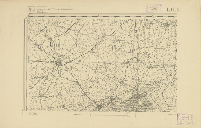 "Paris. Service Géographique de l'Armée, 1889. Ebbe origine dall'Edizione zincografica in quarti di foglio, stabilita dal 1879, per la carta detta de "L'Etat-Major". Infatti non rispondono più il sistema della riproduzione zincografica alle esigenze che la revisione dei fogli imponeva, per un inevitabile logoramento dei rami originali, fu proposta dapprima la correzione degli zinchi, ma questo, importando un lavoro lungo e gravoso, si adottò il procedimento galvanico. I rami galvanici ottenuti e corretti secondo questo sistema presero il nome di "édition type 1889". Allo scopo di facilitare l'incisione fu adoperata la suddivisione in quarti di foglio come per l'edizione zincografica. La revisione dei fogli di questo tipo non fu iniziata che nel 1893. Dal catalogo del S.G.A. risultano mancanti a questa edizione i dipartimenti della "Moselle", del "Bas-Rhin" e del "Haut-Rhin" per i quali non esiste che una edizione in fogli interi aggiornata nel 1901."
