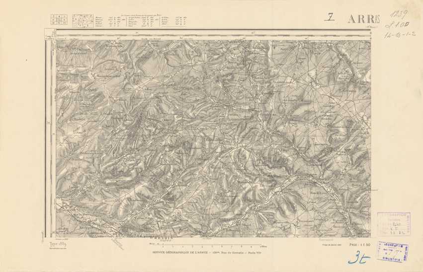 "Paris. Service Géographique de l'Armée, 1889. Ebbe origine dall'Edizione zincografica in quarti di foglio, stabilita dal 1879, per la carta detta de "L'Etat-Major". Infatti non rispondono più il sistema della riproduzione zincografica alle esigenze che la revisione dei fogli imponeva, per un inevitabile logoramento dei rami originali, fu proposta dapprima la correzione degli zinchi, ma questo, importando un lavoro lungo e gravoso, si adottò il procedimento galvanico. I rami galvanici ottenuti e corretti secondo questo sistema presero il nome di "édition type 1889". Allo scopo di facilitare l'incisione fu adoperata la suddivisione in quarti di foglio come per l'edizione zincografica. La revisione dei fogli di questo tipo non fu iniziata che nel 1893. Dal catalogo del S.G.A. risultano mancanti a questa edizione i dipartimenti della "Moselle", del "Bas-Rhin" e del "Haut-Rhin" per i quali non esiste che una edizione in fogli interi aggiornata nel 1901."