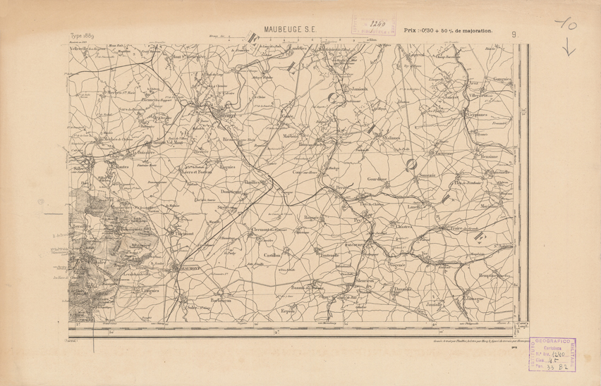 "Paris. Service Géographique de l'Armée, 1889. Ebbe origine dall'Edizione zincografica in quarti di foglio, stabilita dal 1879, per la carta detta de "L'Etat-Major". Infatti non rispondono più il sistema della riproduzione zincografica alle esigenze che la revisione dei fogli imponeva, per un inevitabile logoramento dei rami originali, fu proposta dapprima la correzione degli zinchi, ma questo, importando un lavoro lungo e gravoso, si adottò il procedimento galvanico. I rami galvanici ottenuti e corretti secondo questo sistema presero il nome di "édition type 1889". Allo scopo di facilitare l'incisione fu adoperata la suddivisione in quarti di foglio come per l'edizione zincografica. La revisione dei fogli di questo tipo non fu iniziata che nel 1893. Dal catalogo del S.G.A. risultano mancanti a questa edizione i dipartimenti della "Moselle", del "Bas-Rhin" e del "Haut-Rhin" per i quali non esiste che una edizione in fogli interi aggiornata nel 1901."