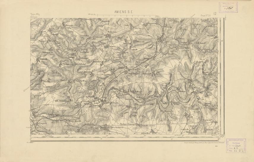 "Paris. Service Géographique de l'Armée, 1889. Ebbe origine dall'Edizione zincografica in quarti di foglio, stabilita dal 1879, per la carta detta de "L'Etat-Major". Infatti non rispondono più il sistema della riproduzione zincografica alle esigenze che la revisione dei fogli imponeva, per un inevitabile logoramento dei rami originali, fu proposta dapprima la correzione degli zinchi, ma questo, importando un lavoro lungo e gravoso, si adottò il procedimento galvanico. I rami galvanici ottenuti e corretti secondo questo sistema presero il nome di "édition type 1889". Allo scopo di facilitare l'incisione fu adoperata la suddivisione in quarti di foglio come per l'edizione zincografica. La revisione dei fogli di questo tipo non fu iniziata che nel 1893. Dal catalogo del S.G.A. risultano mancanti a questa edizione i dipartimenti della "Moselle", del "Bas-Rhin" e del "Haut-Rhin" per i quali non esiste che una edizione in fogli interi aggiornata nel 1901."