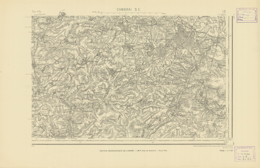 "Paris. Service Géographique de l'Armée, 1889. Ebbe origine dall'Edizione zincografica in quarti di foglio, stabilita dal 1879, per la carta detta de "L'Etat-Major". Infatti non rispondono più il sistema della riproduzione zincografica alle esigenze che la revisione dei fogli imponeva, per un inevitabile logoramento dei rami originali, fu proposta dapprima la correzione degli zinchi, ma questo, importando un lavoro lungo e gravoso, si adottò il procedimento galvanico. I rami galvanici ottenuti e corretti secondo questo sistema presero il nome di "édition type 1889". Allo scopo di facilitare l'incisione fu adoperata la suddivisione in quarti di foglio come per l'edizione zincografica. La revisione dei fogli di questo tipo non fu iniziata che nel 1893. Dal catalogo del S.G.A. risultano mancanti a questa edizione i dipartimenti della "Moselle", del "Bas-Rhin" e del "Haut-Rhin" per i quali non esiste che una edizione in fogli interi aggiornata nel 1901."