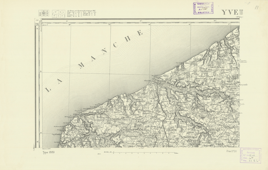 "Paris. Service Géographique de l'Armée, 1889. Ebbe origine dall'Edizione zincografica in quarti di foglio, stabilita dal 1879, per la carta detta de "L'Etat-Major". Infatti non rispondono più il sistema della riproduzione zincografica alle esigenze che la revisione dei fogli imponeva, per un inevitabile logoramento dei rami originali, fu proposta dapprima la correzione degli zinchi, ma questo, importando un lavoro lungo e gravoso, si adottò il procedimento galvanico. I rami galvanici ottenuti e corretti secondo questo sistema presero il nome di "édition type 1889". Allo scopo di facilitare l'incisione fu adoperata la suddivisione in quarti di foglio come per l'edizione zincografica. La revisione dei fogli di questo tipo non fu iniziata che nel 1893. Dal catalogo del S.G.A. risultano mancanti a questa edizione i dipartimenti della "Moselle", del "Bas-Rhin" e del "Haut-Rhin" per i quali non esiste che una edizione in fogli interi aggiornata nel 1901."