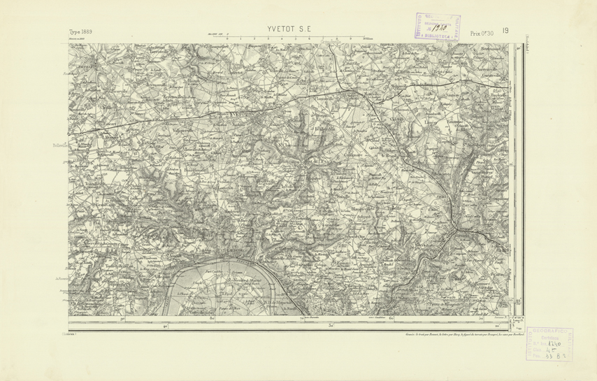 "Paris. Service Géographique de l'Armée, 1889. Ebbe origine dall'Edizione zincografica in quarti di foglio, stabilita dal 1879, per la carta detta de "L'Etat-Major". Infatti non rispondono più il sistema della riproduzione zincografica alle esigenze che la revisione dei fogli imponeva, per un inevitabile logoramento dei rami originali, fu proposta dapprima la correzione degli zinchi, ma questo, importando un lavoro lungo e gravoso, si adottò il procedimento galvanico. I rami galvanici ottenuti e corretti secondo questo sistema presero il nome di "édition type 1889". Allo scopo di facilitare l'incisione fu adoperata la suddivisione in quarti di foglio come per l'edizione zincografica. La revisione dei fogli di questo tipo non fu iniziata che nel 1893. Dal catalogo del S.G.A. risultano mancanti a questa edizione i dipartimenti della "Moselle", del "Bas-Rhin" e del "Haut-Rhin" per i quali non esiste che una edizione in fogli interi aggiornata nel 1901."