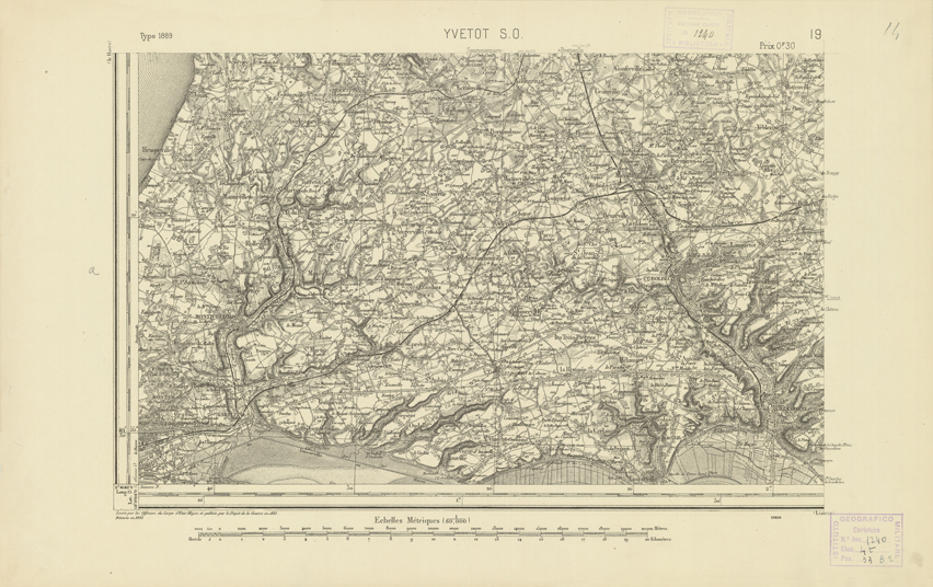 "Paris. Service Géographique de l'Armée, 1889. Ebbe origine dall'Edizione zincografica in quarti di foglio, stabilita dal 1879, per la carta detta de "L'Etat-Major". Infatti non rispondono più il sistema della riproduzione zincografica alle esigenze che la revisione dei fogli imponeva, per un inevitabile logoramento dei rami originali, fu proposta dapprima la correzione degli zinchi, ma questo, importando un lavoro lungo e gravoso, si adottò il procedimento galvanico. I rami galvanici ottenuti e corretti secondo questo sistema presero il nome di "édition type 1889". Allo scopo di facilitare l'incisione fu adoperata la suddivisione in quarti di foglio come per l'edizione zincografica. La revisione dei fogli di questo tipo non fu iniziata che nel 1893. Dal catalogo del S.G.A. risultano mancanti a questa edizione i dipartimenti della "Moselle", del "Bas-Rhin" e del "Haut-Rhin" per i quali non esiste che una edizione in fogli interi aggiornata nel 1901."