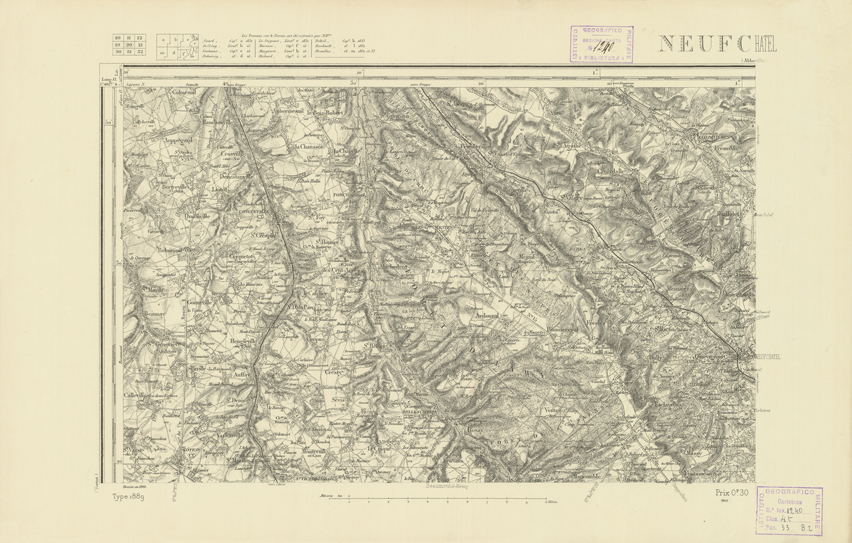 "Paris. Service Géographique de l'Armée, 1889. Ebbe origine dall'Edizione zincografica in quarti di foglio, stabilita dal 1879, per la carta detta de "L'Etat-Major". Infatti non rispondono più il sistema della riproduzione zincografica alle esigenze che la revisione dei fogli imponeva, per un inevitabile logoramento dei rami originali, fu proposta dapprima la correzione degli zinchi, ma questo, importando un lavoro lungo e gravoso, si adottò il procedimento galvanico. I rami galvanici ottenuti e corretti secondo questo sistema presero il nome di "édition type 1889". Allo scopo di facilitare l'incisione fu adoperata la suddivisione in quarti di foglio come per l'edizione zincografica. La revisione dei fogli di questo tipo non fu iniziata che nel 1893. Dal catalogo del S.G.A. risultano mancanti a questa edizione i dipartimenti della "Moselle", del "Bas-Rhin" e del "Haut-Rhin" per i quali non esiste che una edizione in fogli interi aggiornata nel 1901."