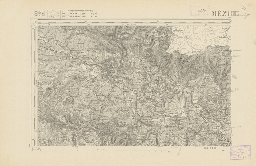 "Paris. Service Géographique de l'Armée, 1889. Ebbe origine dall'Edizione zincografica in quarti di foglio, stabilita dal 1879, per la carta detta de "L'Etat-Major". Infatti non rispondono più il sistema della riproduzione zincografica alle esigenze che la revisione dei fogli imponeva, per un inevitabile logoramento dei rami originali, fu proposta dapprima la correzione degli zinchi, ma questo, importando un lavoro lungo e gravoso, si adottò il procedimento galvanico. I rami galvanici ottenuti e corretti secondo questo sistema presero il nome di "édition type 1889". Allo scopo di facilitare l'incisione fu adoperata la suddivisione in quarti di foglio come per l'edizione zincografica. La revisione dei fogli di questo tipo non fu iniziata che nel 1893. Dal catalogo del S.G.A. risultano mancanti a questa edizione i dipartimenti della "Moselle", del "Bas-Rhin" e del "Haut-Rhin" per i quali non esiste che una edizione in fogli interi aggiornata nel 1901."