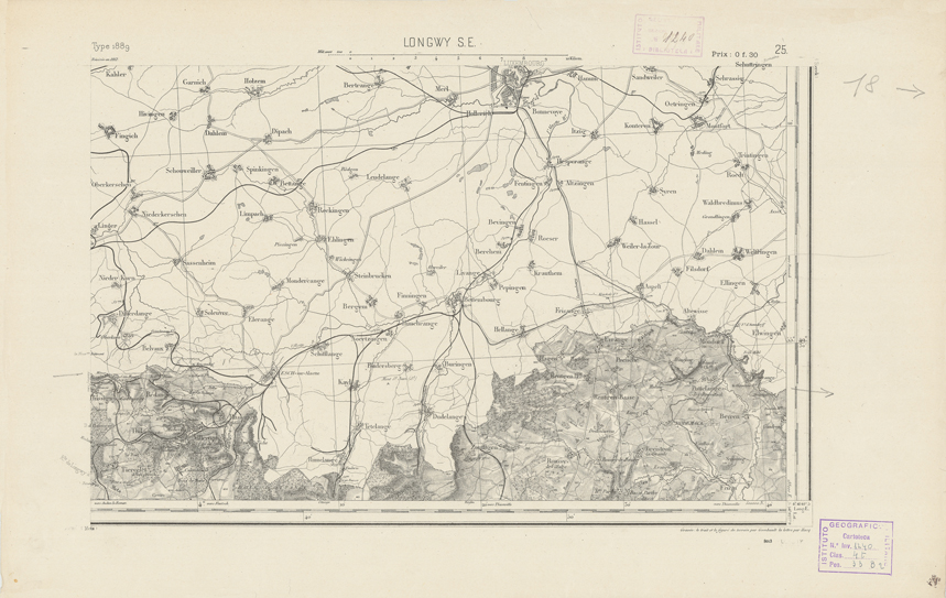 "Paris. Service Géographique de l'Armée, 1889. Ebbe origine dall'Edizione zincografica in quarti di foglio, stabilita dal 1879, per la carta detta de "L'Etat-Major". Infatti non rispondono più il sistema della riproduzione zincografica alle esigenze che la revisione dei fogli imponeva, per un inevitabile logoramento dei rami originali, fu proposta dapprima la correzione degli zinchi, ma questo, importando un lavoro lungo e gravoso, si adottò il procedimento galvanico. I rami galvanici ottenuti e corretti secondo questo sistema presero il nome di "édition type 1889". Allo scopo di facilitare l'incisione fu adoperata la suddivisione in quarti di foglio come per l'edizione zincografica. La revisione dei fogli di questo tipo non fu iniziata che nel 1893. Dal catalogo del S.G.A. risultano mancanti a questa edizione i dipartimenti della "Moselle", del "Bas-Rhin" e del "Haut-Rhin" per i quali non esiste che una edizione in fogli interi aggiornata nel 1901."
