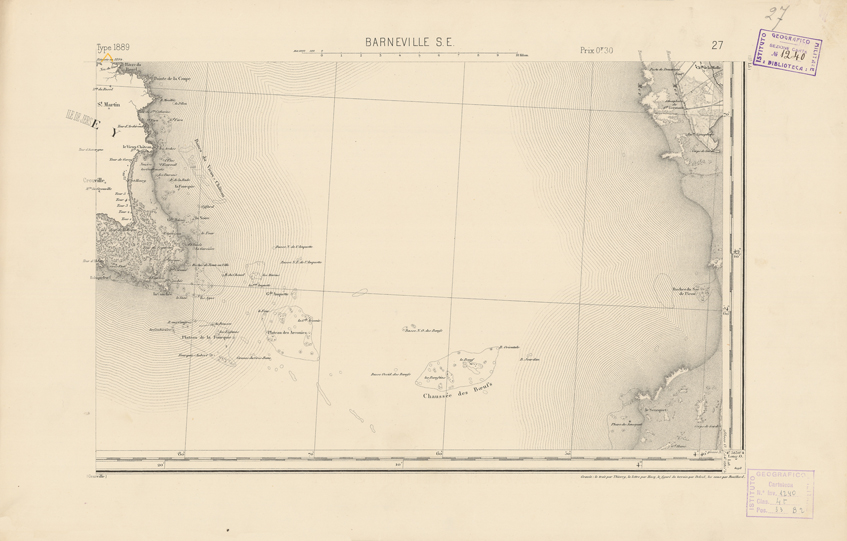 "Paris. Service Géographique de l'Armée, 1889. Ebbe origine dall'Edizione zincografica in quarti di foglio, stabilita dal 1879, per la carta detta de "L'Etat-Major". Infatti non rispondono più il sistema della riproduzione zincografica alle esigenze che la revisione dei fogli imponeva, per un inevitabile logoramento dei rami originali, fu proposta dapprima la correzione degli zinchi, ma questo, importando un lavoro lungo e gravoso, si adottò il procedimento galvanico. I rami galvanici ottenuti e corretti secondo questo sistema presero il nome di "édition type 1889". Allo scopo di facilitare l'incisione fu adoperata la suddivisione in quarti di foglio come per l'edizione zincografica. La revisione dei fogli di questo tipo non fu iniziata che nel 1893. Dal catalogo del S.G.A. risultano mancanti a questa edizione i dipartimenti della "Moselle", del "Bas-Rhin" e del "Haut-Rhin" per i quali non esiste che una edizione in fogli interi aggiornata nel 1901."