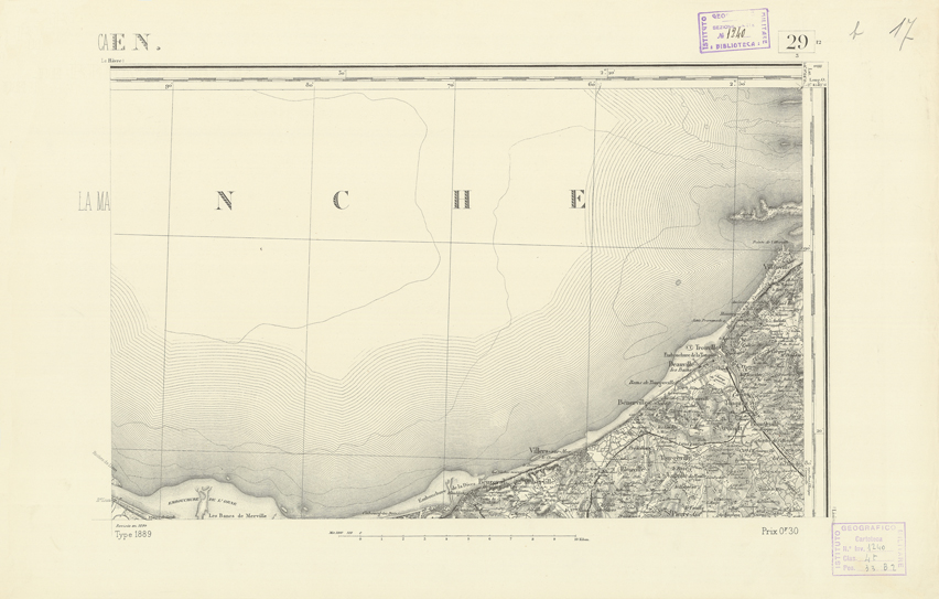 "Paris. Service Géographique de l'Armée, 1889. Ebbe origine dall'Edizione zincografica in quarti di foglio, stabilita dal 1879, per la carta detta de "L'Etat-Major". Infatti non rispondono più il sistema della riproduzione zincografica alle esigenze che la revisione dei fogli imponeva, per un inevitabile logoramento dei rami originali, fu proposta dapprima la correzione degli zinchi, ma questo, importando un lavoro lungo e gravoso, si adottò il procedimento galvanico. I rami galvanici ottenuti e corretti secondo questo sistema presero il nome di "édition type 1889". Allo scopo di facilitare l'incisione fu adoperata la suddivisione in quarti di foglio come per l'edizione zincografica. La revisione dei fogli di questo tipo non fu iniziata che nel 1893. Dal catalogo del S.G.A. risultano mancanti a questa edizione i dipartimenti della "Moselle", del "Bas-Rhin" e del "Haut-Rhin" per i quali non esiste che una edizione in fogli interi aggiornata nel 1901."